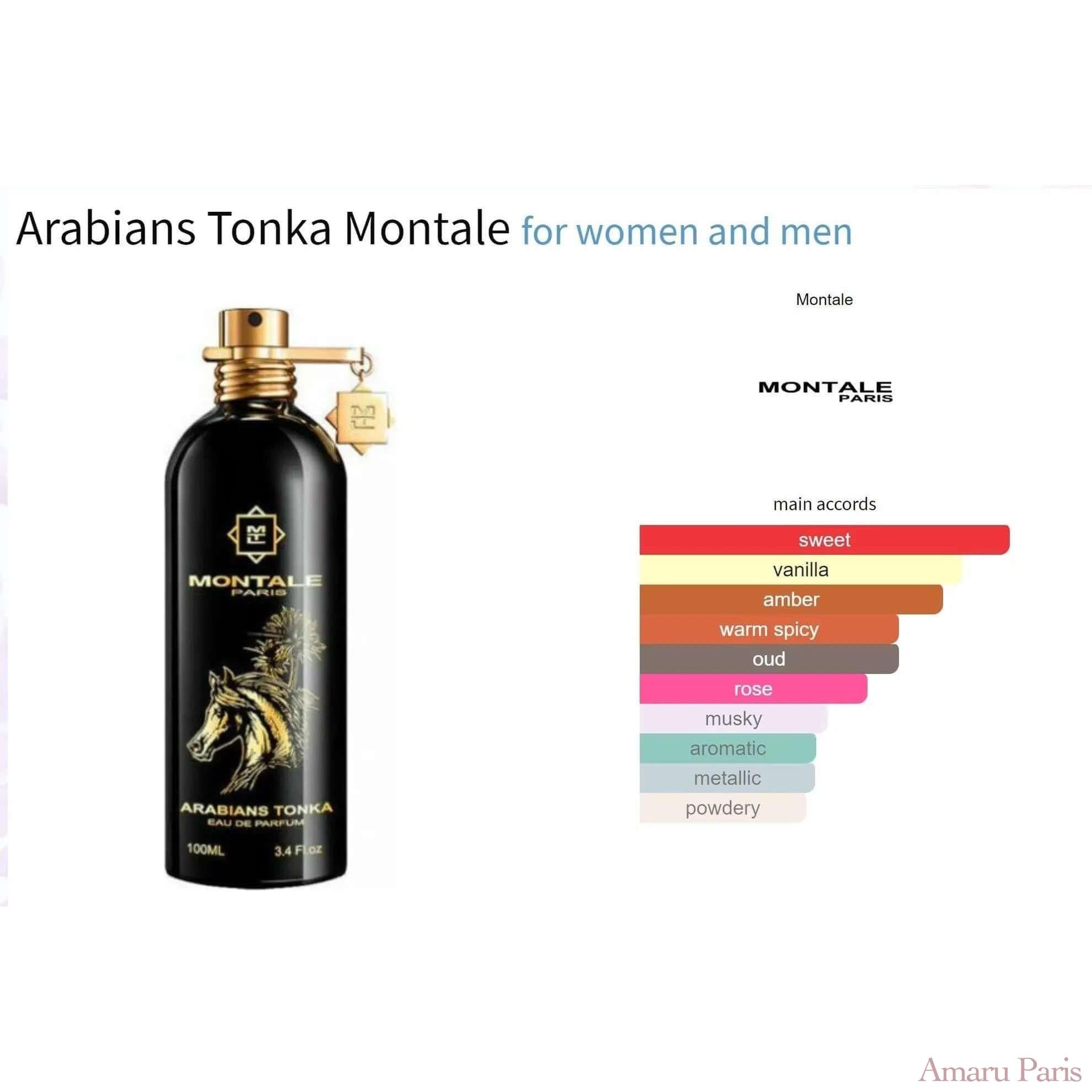 Arabians Tonka von Montale ist ein Amber Woody-Duft für Frauen und Männer. Arabians Tonka ist seit 2019 erhältlich. Die Kopfnoten sind Safran und Bergamotte; Die Herznoten sind Agarholz (Oud) und bulgarische Rose; Die Basisnoten sind Zuckerrohr, Tonkabohne, Amber, weißer Moschus und Eichenmoos.