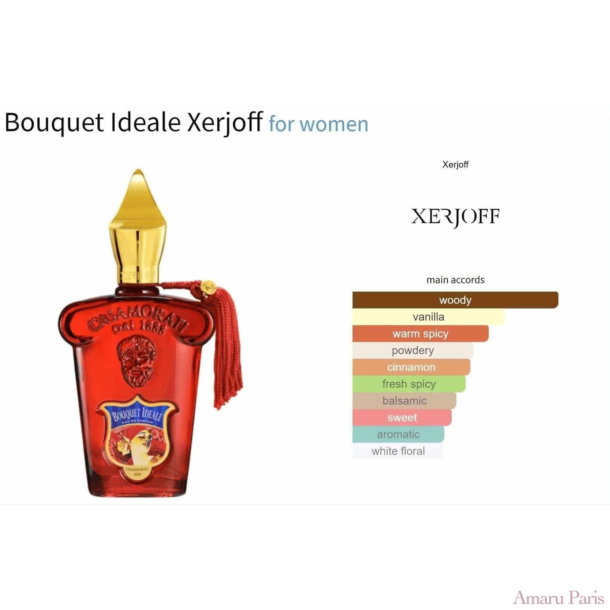 Bouquet Ideale von Xerjoff ist ein holziger Amberduft für Damen. Bouquet Ideale wurde 2010 auf den Markt gebracht. Die Nase hinter diesem Duft ist Jacques Flori. Die Kopfnoten sind Zimt und Muskatnuss; Die Herznoten sind Guajakholz, Sandelholz, Virginiazeder und Papyrus; Basisnoten sind Vanille, Cumarin, Tabakblüte, französisches Labdanum und Moschus.