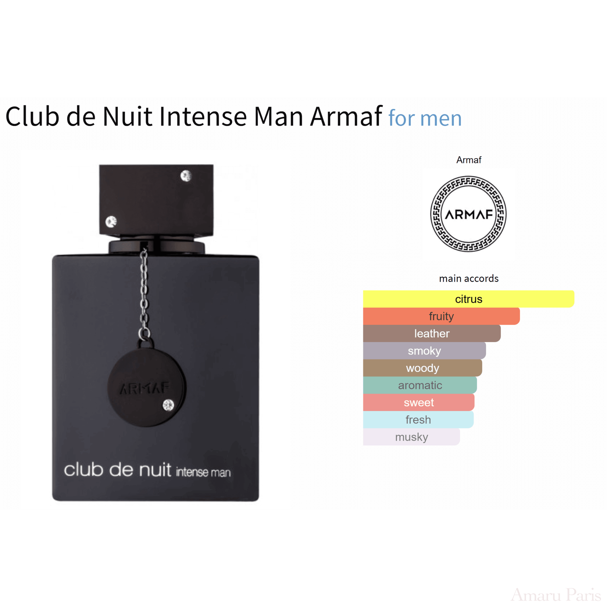 Club de Nuit Intense Man von Armaf ist ein holzig-würziger Duft für Männer. Club de Nuit Intense Man wurde 2015 auf den Markt gebracht. Die Kopfnoten sind Zitrone, Ananas, Bergamotte, schwarze Johannisbeere und Apfel; die Herznoten sind Birke, Jasmin und Rose; die Basisnoten sind Moschus, Ambra, Patchouli und Vanille.
