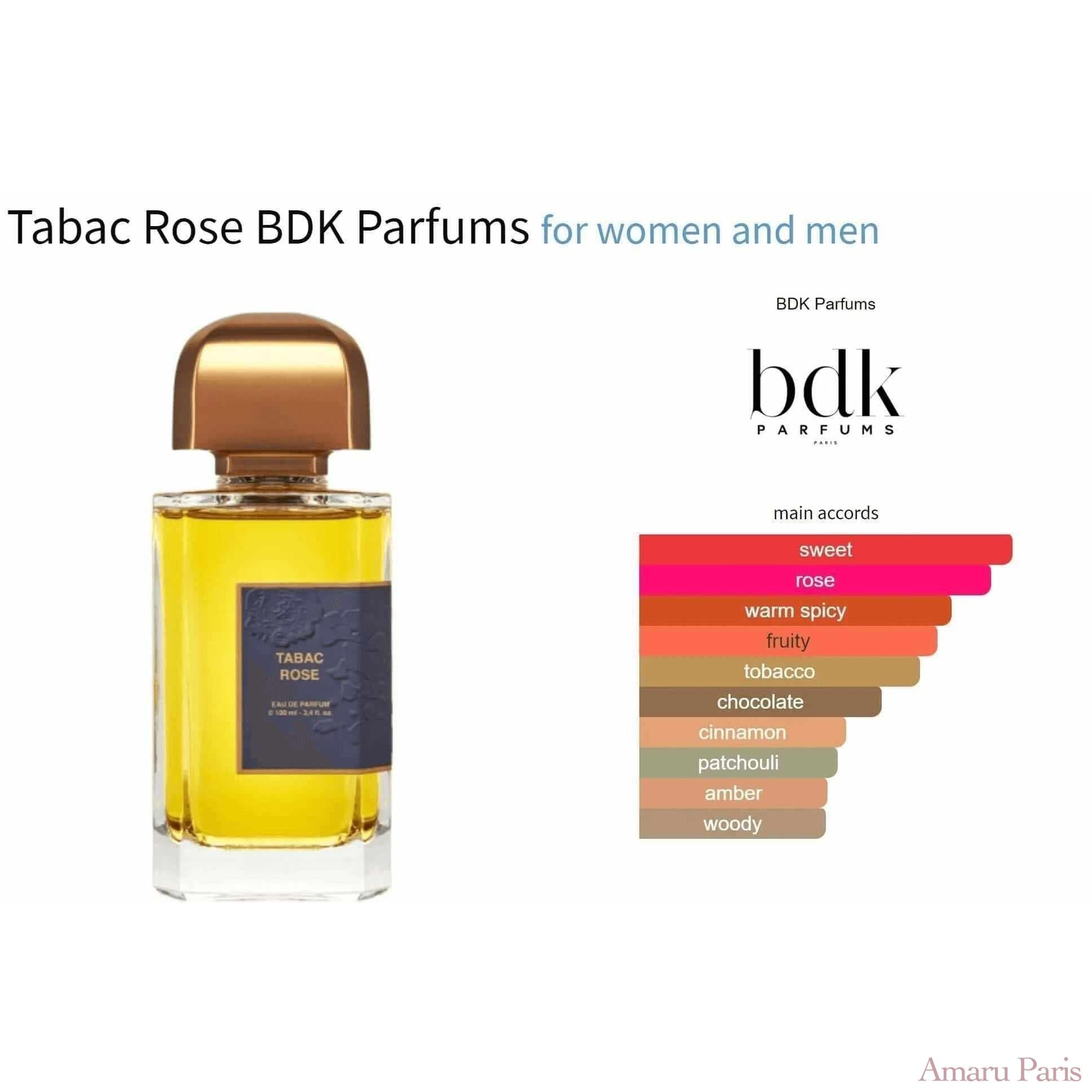 Tabac Rose von BDK Parfums ist ein Amber Spicy-Duft für Frauen und Männer. Tabac Rose wurde 2020 auf den Markt gebracht. Die Nase hinter diesem Duft ist Julien Rasquinet. Die Kopfnoten sind Pflaume, rosa Pfeffer und italienische Zitrone; die Herznoten sind türkische Rose, Schokolade und Zimt; die Basisnoten sind Tabak, indonesisches Patchouliblatt und spanisches Labdanum.