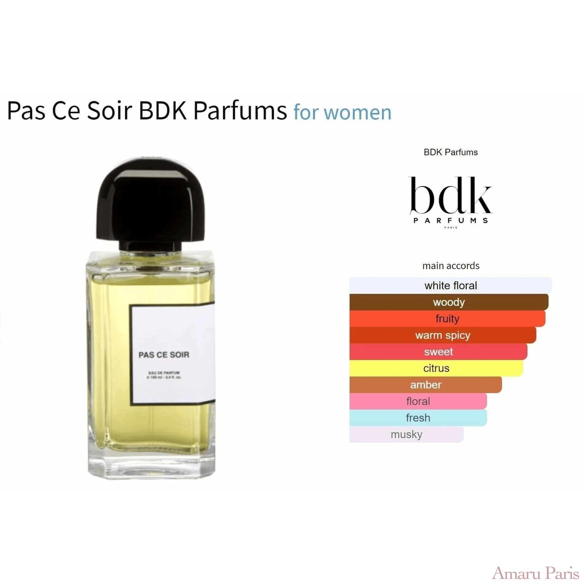 Pas Сe Soir von BDK Parfums ist ein blumiger Duft für Frauen. Pas Сe Soir wurde 2016 auf den Markt gebracht. Die Nase hinter diesem Duft ist David Benedek. Die Kopfnoten sind Ingwer, Mandarine und schwarzer Pfeffer; die Herznoten sind Quitte, marokkanischer Jasmin und Orangenblüte; die Basisnoten sind Cashmeran, Amberholz und Singapur-Patchouli.