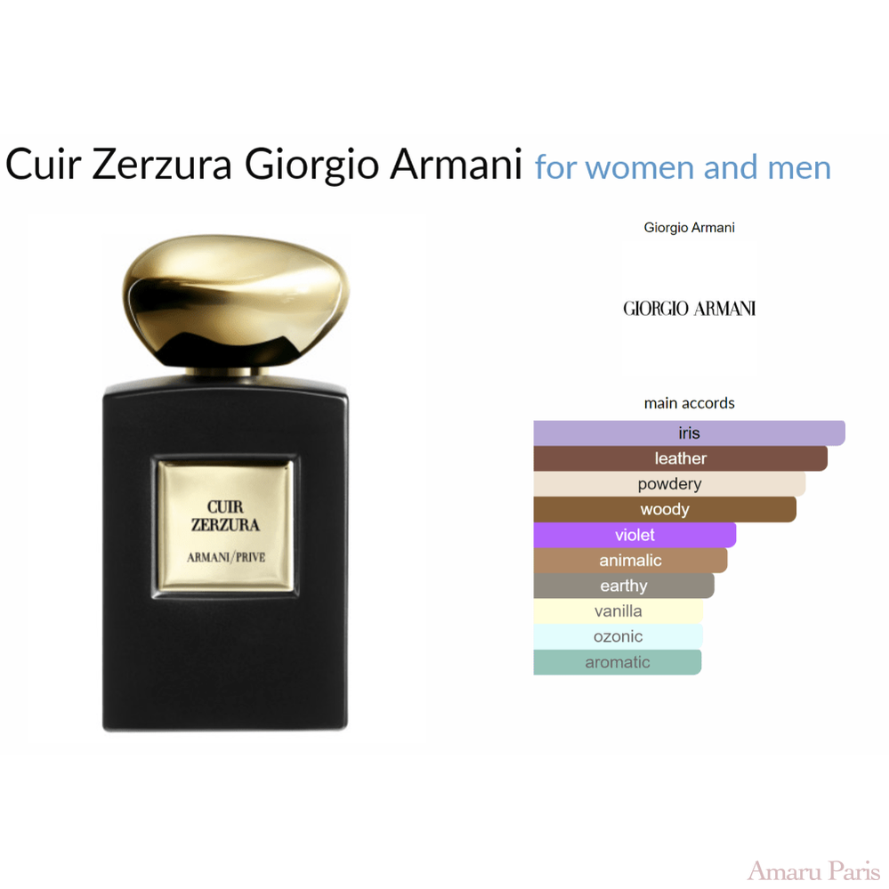 Zerzura Leder von Giorgio Armani ist ein Lederduft für Frauen und Männer. Zerzura Leder wurde im Jahr 2020 auf den Markt gebracht. Die Nase hinter diesem Duft ist Nelly Hachem-Ruiz. Die Kopfnoten sind Veilchenblatt, Elemiharz und Mandarine; Die Herznoten sind Iris und Rose; Basisnoten sind Leder, Zeder und Bourbon-Vanille.