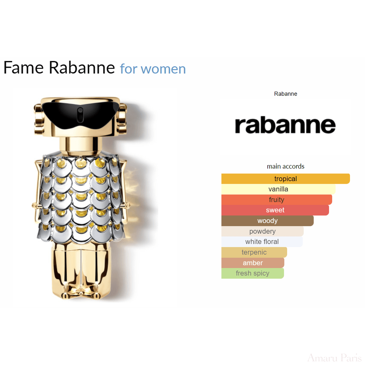 Ruhm von Rabanne ist ein blumiger, holziger und moschusartiger Duft für Frauen. Dies ist ein neuer Duft. Ruhm wurde 2022 auf den Markt gebracht. Fame wurde von Dora Baghriche, Marie Salamagne, Alberto Morillas und Fabrice Pellegrin kreiert. Die Kopfnoten sind Mango und Bergamotte; die Herznoten sind Jasmin und Weihrauch; die Basisnoten sind Vanille und Sandelholz.