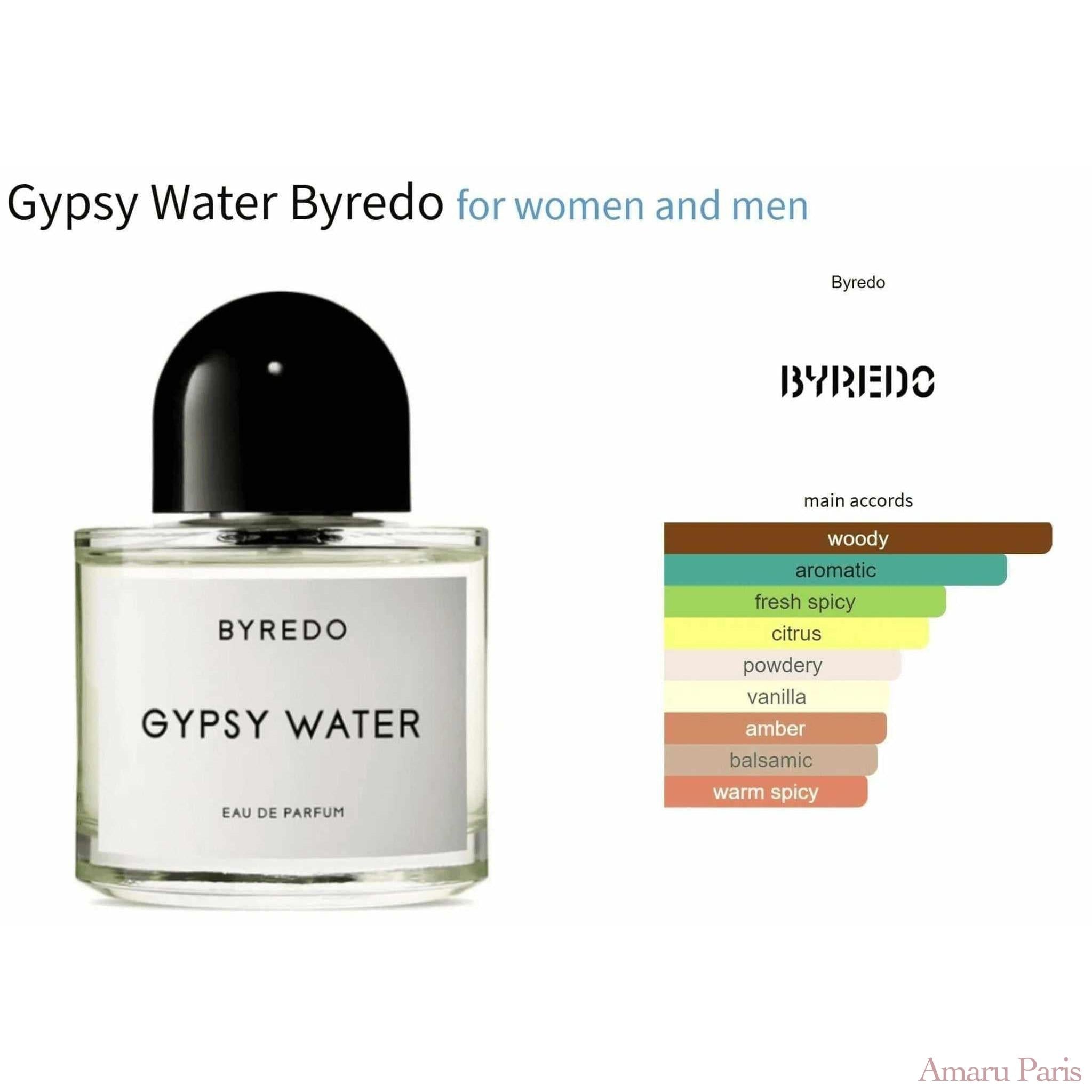 Gypsy Water von Byredo ist ein holzig-aromatischer Duft für Damen und Herren. Gypsy Water wurde 2008 auf den Markt gebracht. Die Kopfnoten sind Wacholder, Zitrone, Bergamotte und Pfeffer; Die Herznoten sind Kiefernnadeln, Weihrauch und Iriswurzel; Die Basisnoten sind Vanille, Sandelholz und Amber.