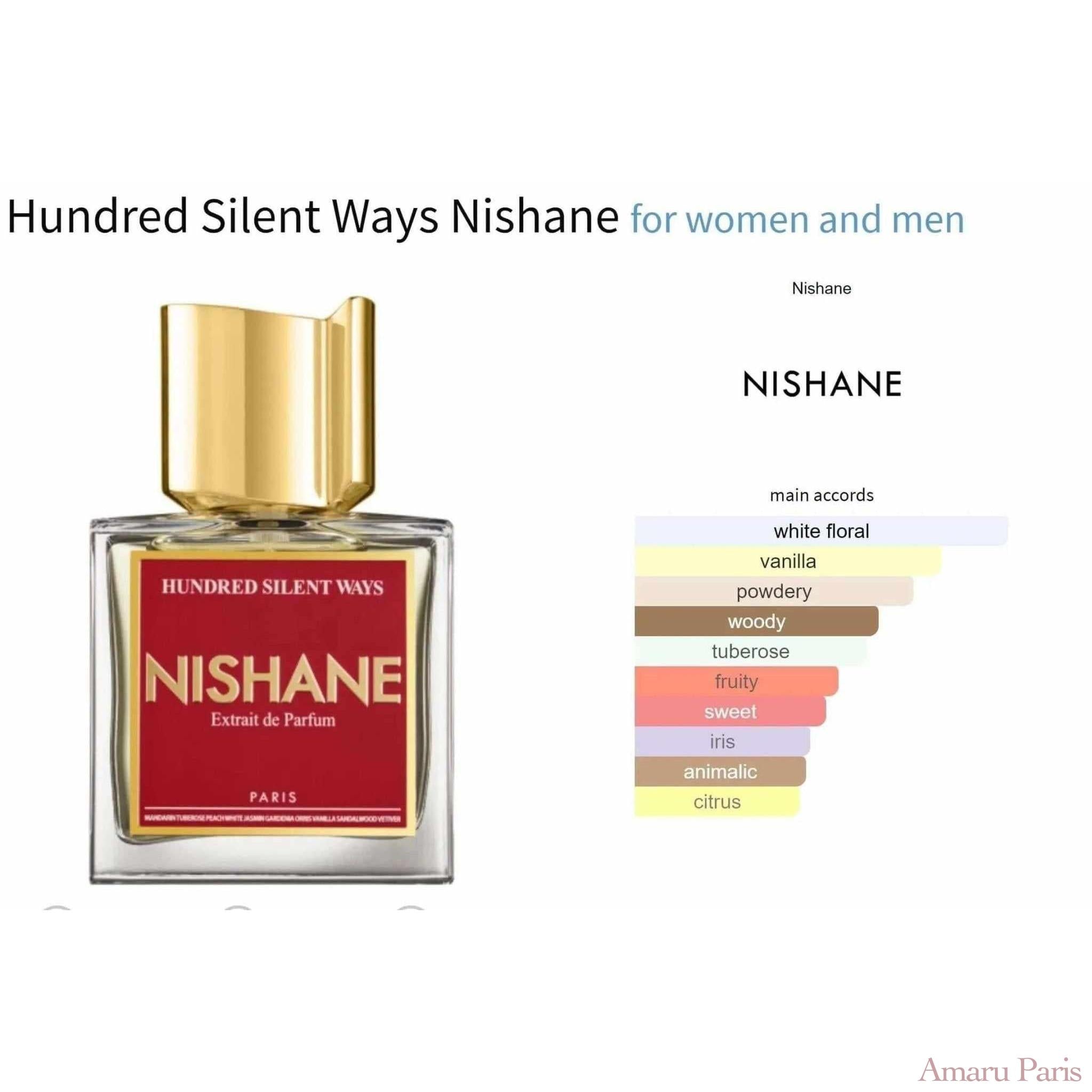 Hundred Silent Ways von Nishane ist ein Duft für Frauen und Männer. Hundred Silent Ways wurde 2016 auf den Markt gebracht. Die Kopfnoten sind Tuberose, Pfirsich und Mandarine; Die Herznoten sind Gardenie, Jasmin und Iris; Die Basisnoten sind Vanille, Sandelholz und Vetiver.