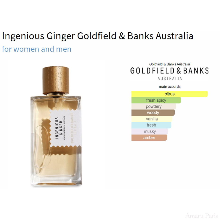 Genialer Ingwer von Goldfield & Banks Australien ist ein Duft für Frauen und Männer. Dies ist ein neuer Duft. Genialer Ingwer wurde 2023 auf den Markt gebracht. Die Nase hinter diesem Duft ist Hamid Merati-Kashani. Die Kopfnoten sind Ingwerblüte, Zitrone und Bergamotte; Die Herznoten sind Mandarine, Magnolie, Jasmin und Rose; Basisnoten sind Vanille, Sandelholz, Amber, Cashmere, Moschus und Patchouli.