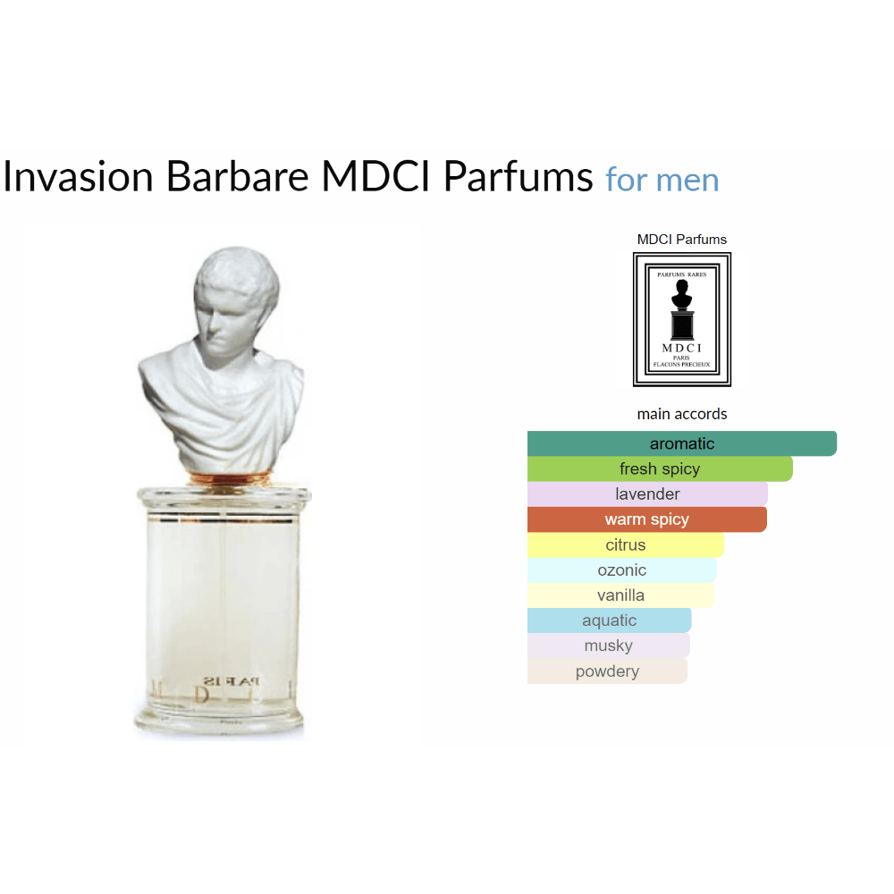Invasion Barbare de MDCI Parfums est un parfum oriental fougère pour homme. Invasion Barbare a été lancé en 2005. Le nez derrière ce parfum est Stéphanie Bakouche. Les notes de tête sont Feuille de violette, Pamplemousse et Bergamote ; les notes de cœur sont Lavande, Cardamome, Thym et Gingembre ; les notes de fond sont Vanille, Musc et Patchouli.