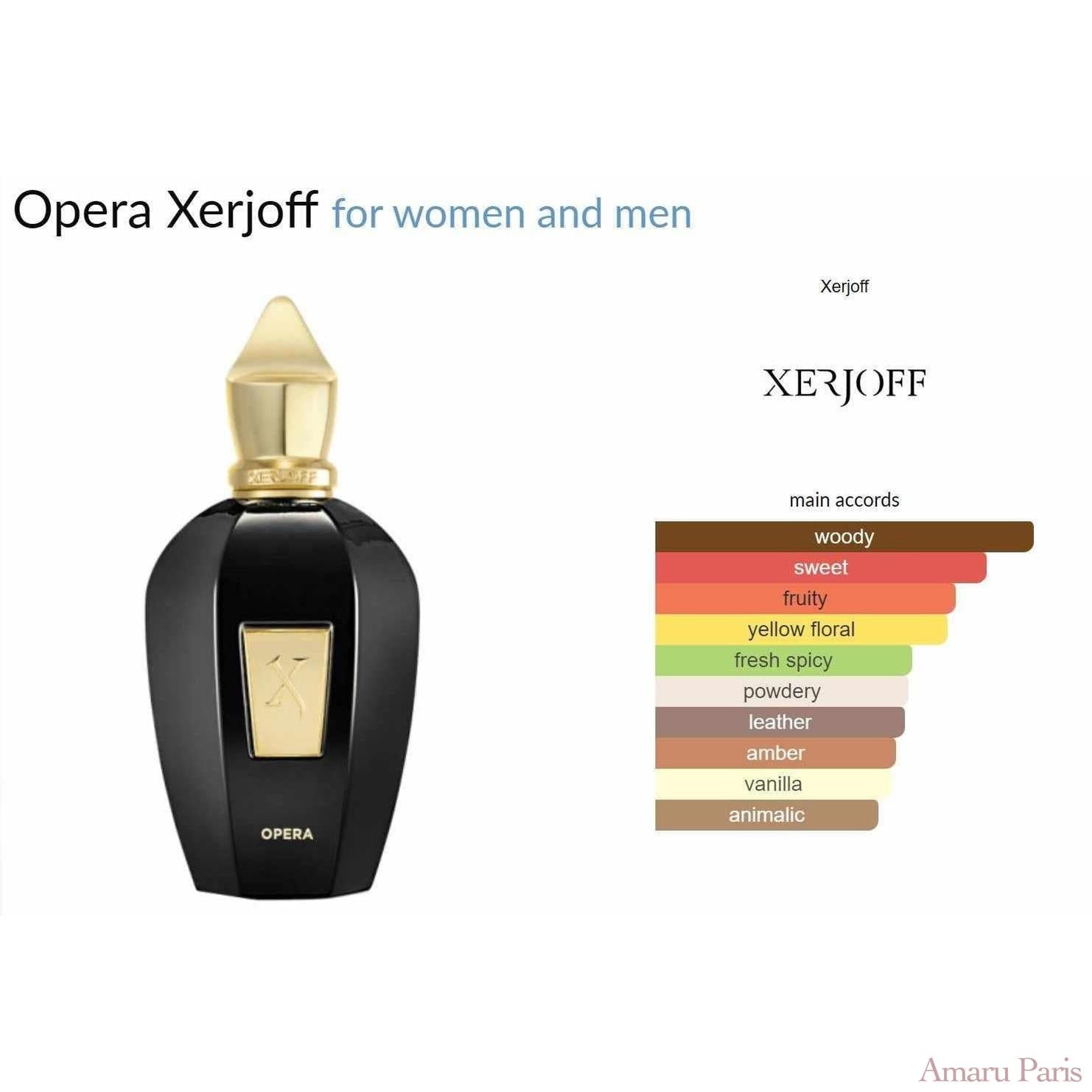 Oper von Xerjoff ist ein holziger, blumiger Moschusduft für Frauen und Männer. Oper wurde 2019 auf den Markt gebracht. Die Nase hinter diesem Duft ist Chris Maurice. Die Kopfnoten sind Früchte und türkische Rose; Die Herznoten sind Ylang-Ylang, Muskatnuss, Leder und Amber; Die Basisnoten sind Vanille, Patschuli, Moschus, Virginiazeder und haitianisches Vetiver.