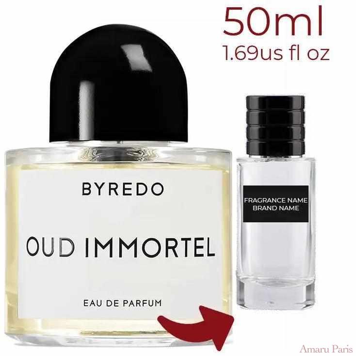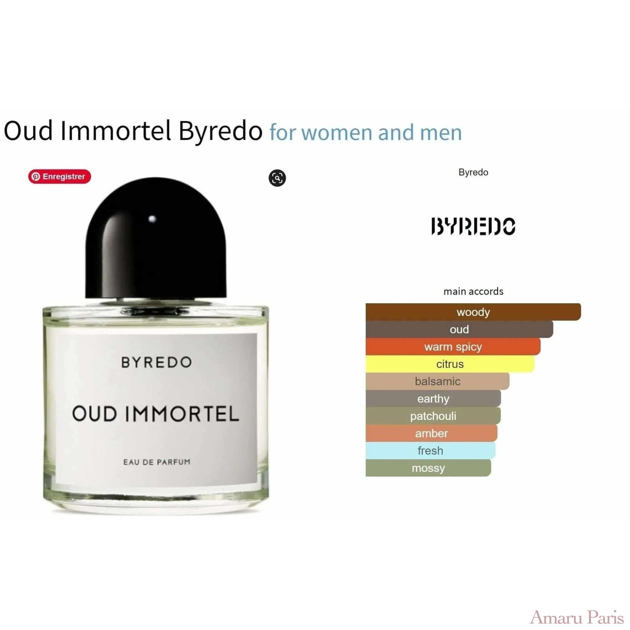 Oud Immortel von Byredo ist ein holziger Chypre-Duft für Frauen und Männer. Oud Immortel wurde 2010 auf den Markt gebracht. Die Kopfnoten sind Limoncello, Weihrauch und Kardamom; Die Herznoten sind Agarholz (Oud), Patschuli, Papyrus und brasilianisches Rosenholz; Die Basisnoten sind Eichenmoos und Tabak.