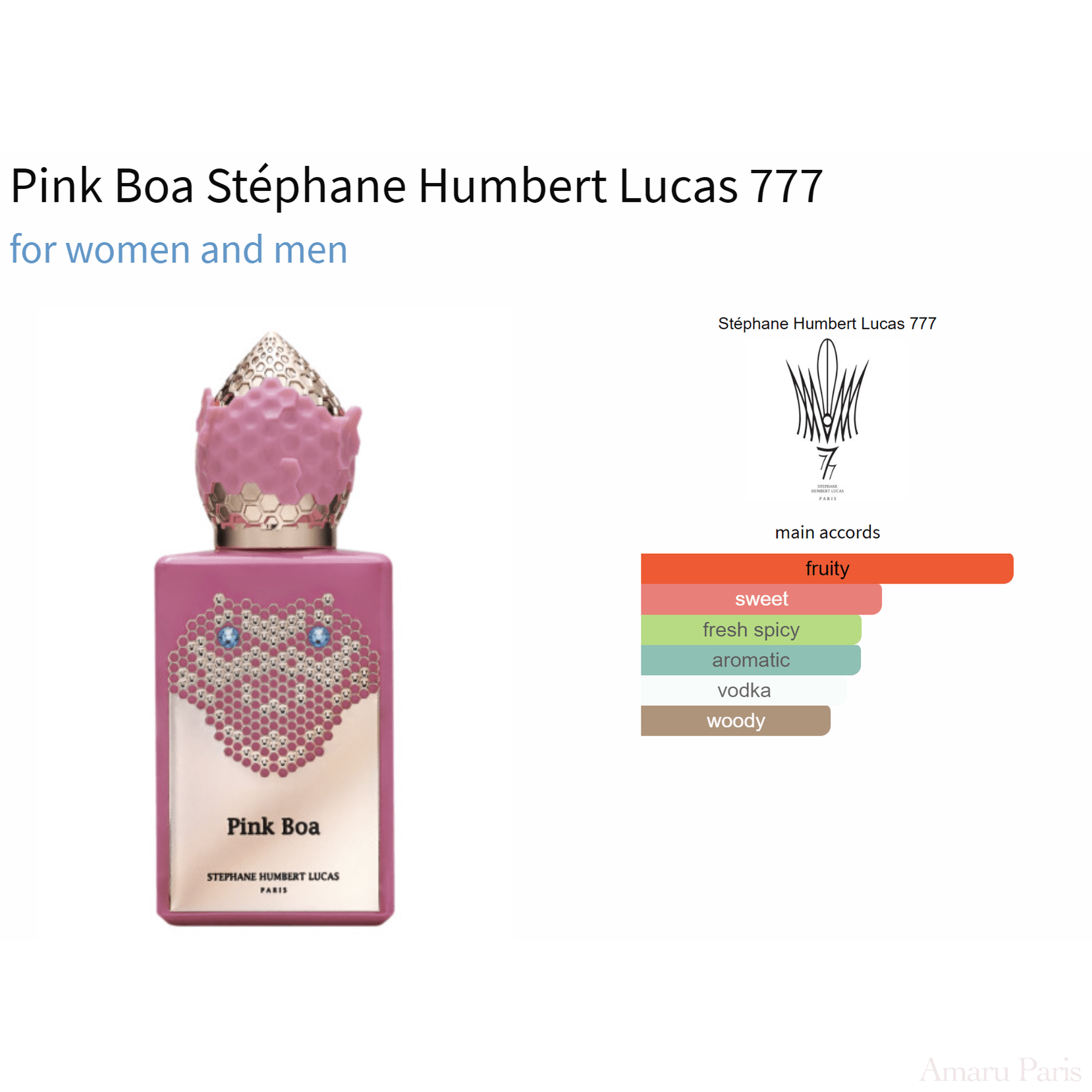 Rosa Boa von Stéphane Humbert Lucas 777 ist ein blumig-fruchtiger Duft für Frauen und Männer. Dies ist ein neuer Duft. Rosa Boa wurde 2022 auf den Markt gebracht. Die Nase hinter diesem Duft ist Stéphane Humbert Lucas. Die Kopfnoten sind schwarze Johannisbeere, Rosmarin, Bergamotte und Brombeere; Die Herznoten sind Himbeere, Wodka, Basilikum und Maiglöckchen; Die Basisnoten sind Moschus, Erdbeere, Sandelholz, Amber, Pfirsich, Patschuli und Weihrauch.