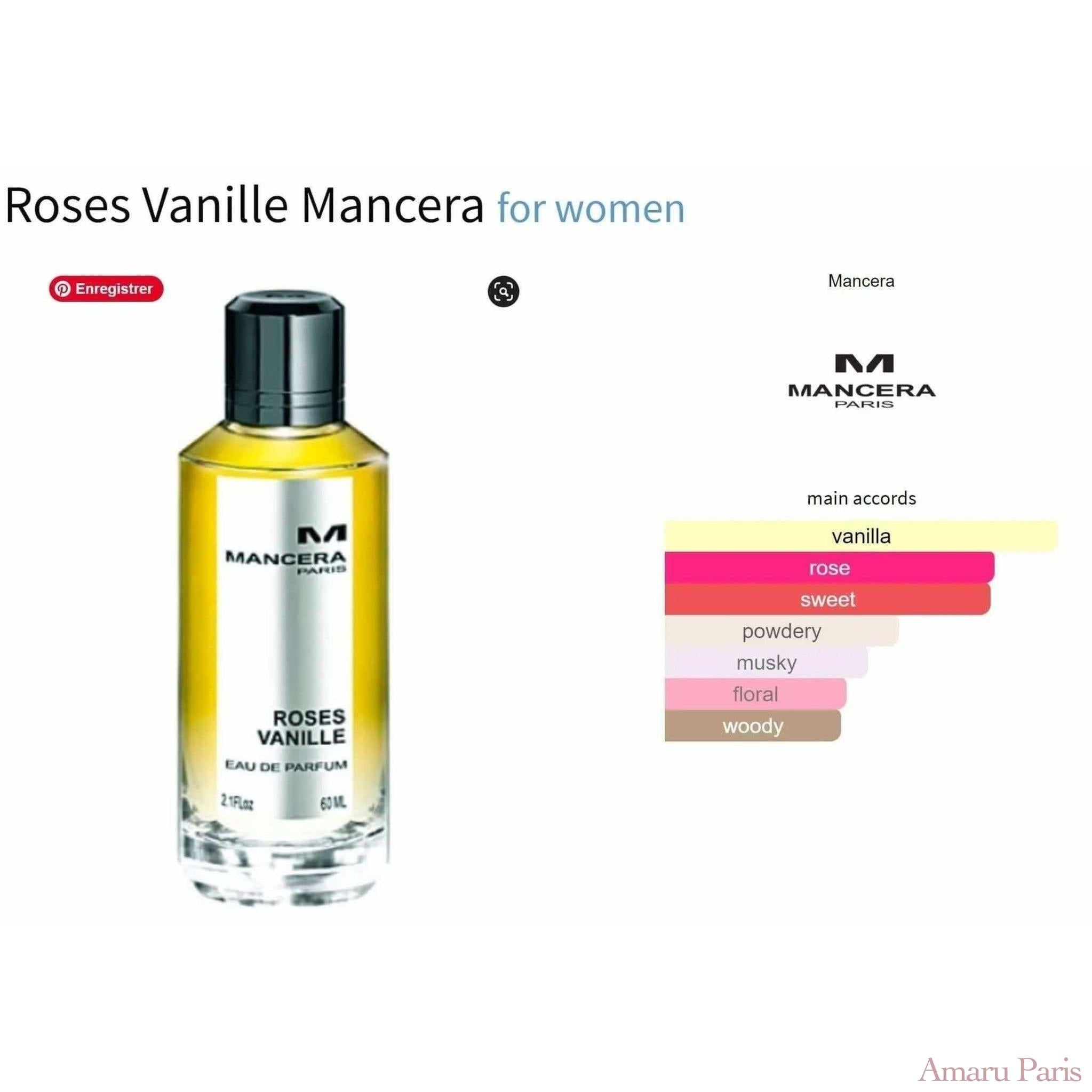 Roses Vanille von Mancera ist ein Amber-Vanilla-Duft für Frauen. Roses Vanille wurde 2011 auf den Markt gebracht. Die Nase hinter diesem Duft ist Pierre Montale. Die Kopfnote ist italienische Zitrone; die Herznote ist türkische Rose; die Basisnoten sind Vanille, weißer Moschus und Zeder.