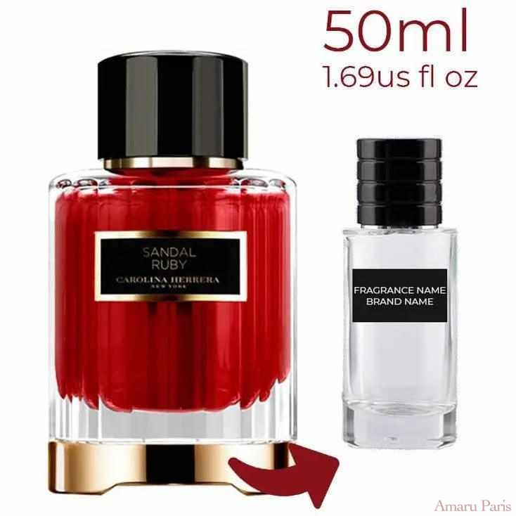 Sandal Ruby von Carolina Herrera ist ein bernsteinfarbener Blumenduft für Damen und Herren. Sandal Ruby ist seit 2019 erhältlich. Die Kopfnoten sind Zimt und schwarzer Pfeffer; Die Herznoten sind Tuberose und Geranie; Die Basisnoten sind Sandelholz, Patschuli und Atlaszeder.