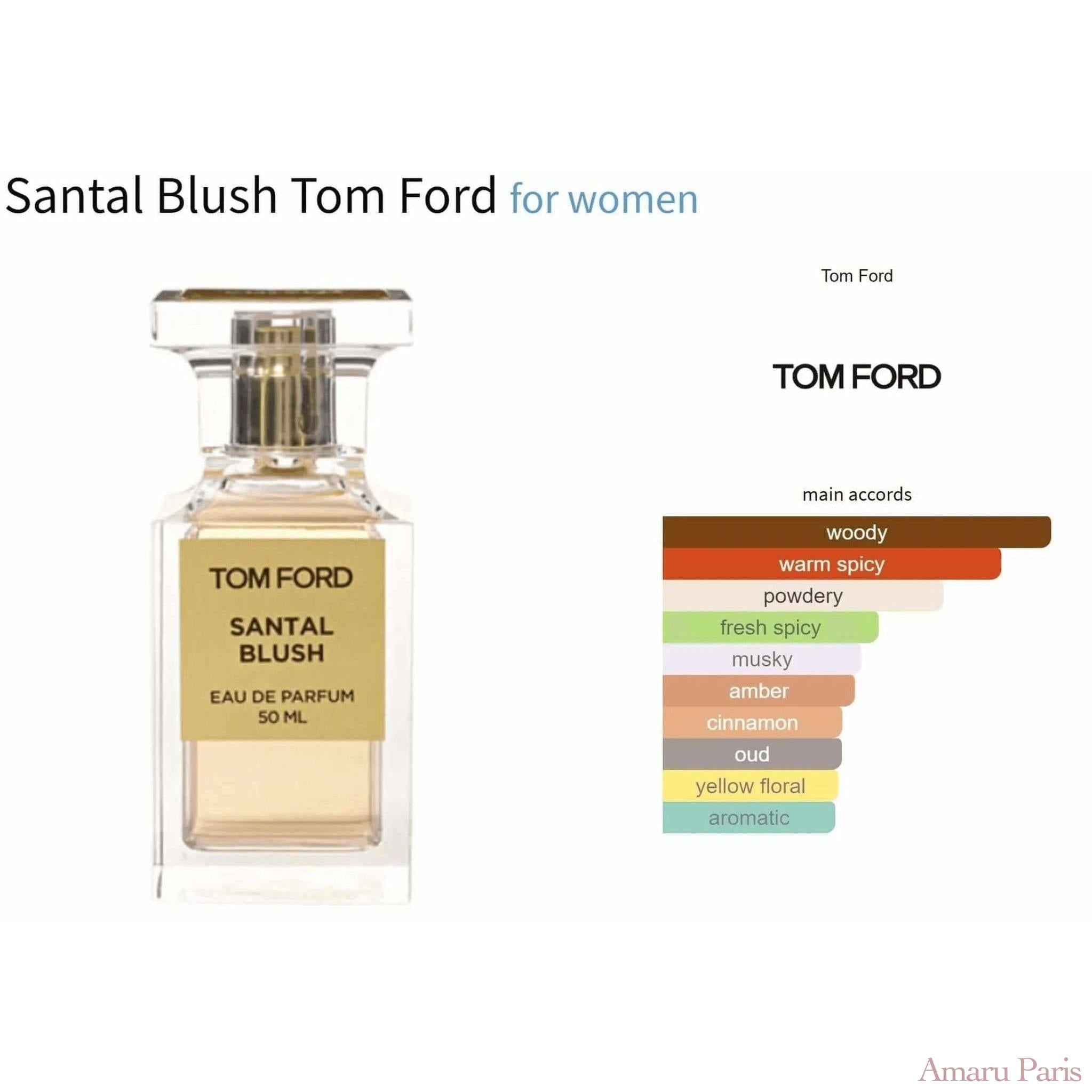 Santal Blush von Tom Ford ist ein Amber Woody-Duft für Frauen. Santal Blush wurde 2011 auf den Markt gebracht. Die Nase hinter diesem Duft ist Yann Vasnier. Die Kopfnoten sind Gewürze, Zimt, Kümmel, Bockshornklee und Karottensamen; Die Herznoten sind Ylang-Ylang, Jasmin und Rose; Die Basisnoten sind Sandelholz, Benzoe, Virginiazeder, Moschus und Adlerholz (Oud).