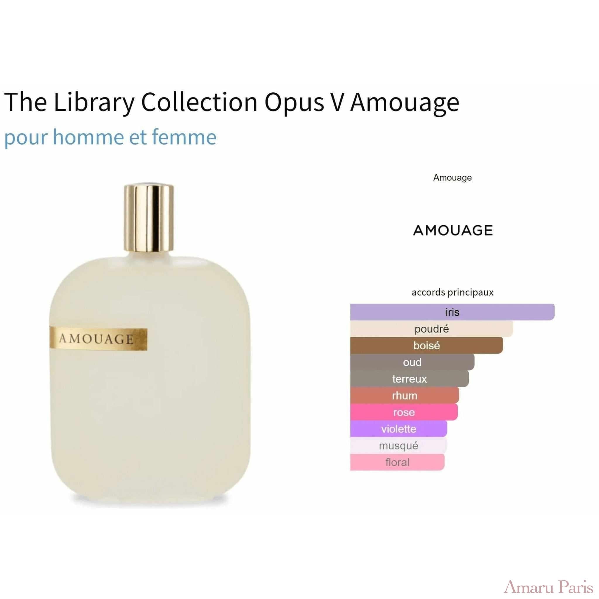 The Library Collection Opus V von Amouage ist ein holzig-blumiger Moschusduft für Damen und Herren. Die Library Collection Opus V wurde 2011 auf den Markt gebracht. Die Nase hinter diesem Duft ist Jacques Cavallier. Die Kopfnoten sind Iriswurzel und Rum; Die Herznoten sind Iris, Rose und Jasmin; Die Basisnoten sind Agarholz (Oud), holzige Noten und Civetta.