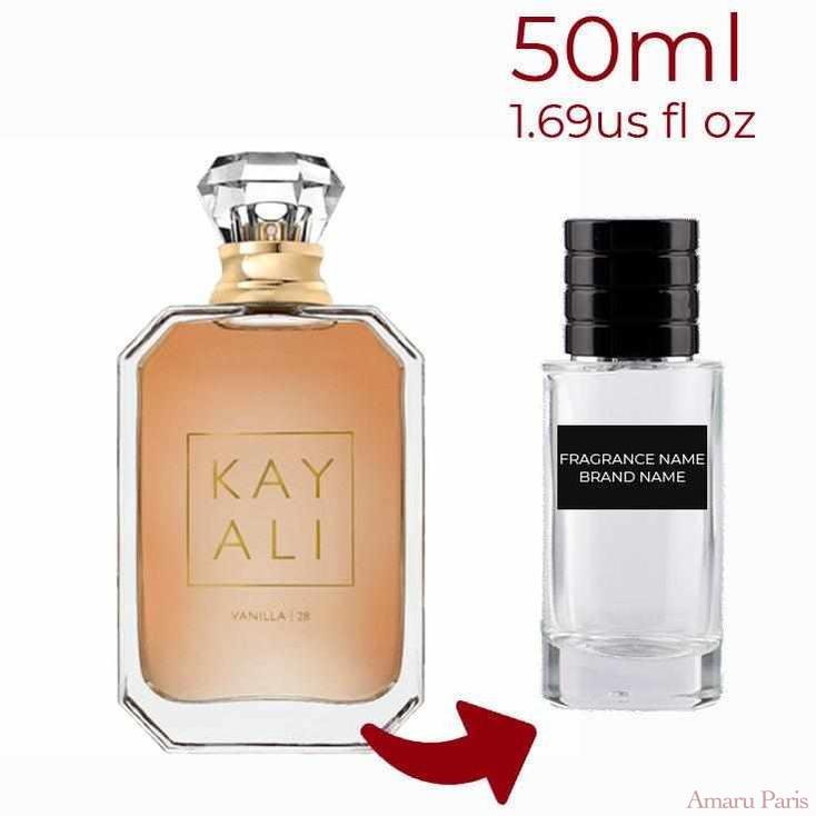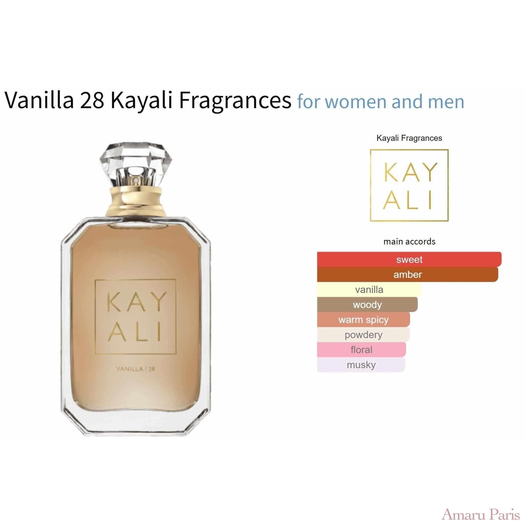 Vanilla 28 von Kayali Fragrances ist ein Amber-Vanilla-Duft für Frauen und Männer. Vanilla 28 wurde 2018 auf den Markt gebracht. Die Nase hinter diesem Duft ist Gabriela Chelariu. Die Kopfnoten sind Vanilleorchidee und Jasmin; die Herznoten sind brauner Zucker und Tonkabohne; die Basisnoten sind Amber, Amberholz, Moschus und Patchouli.