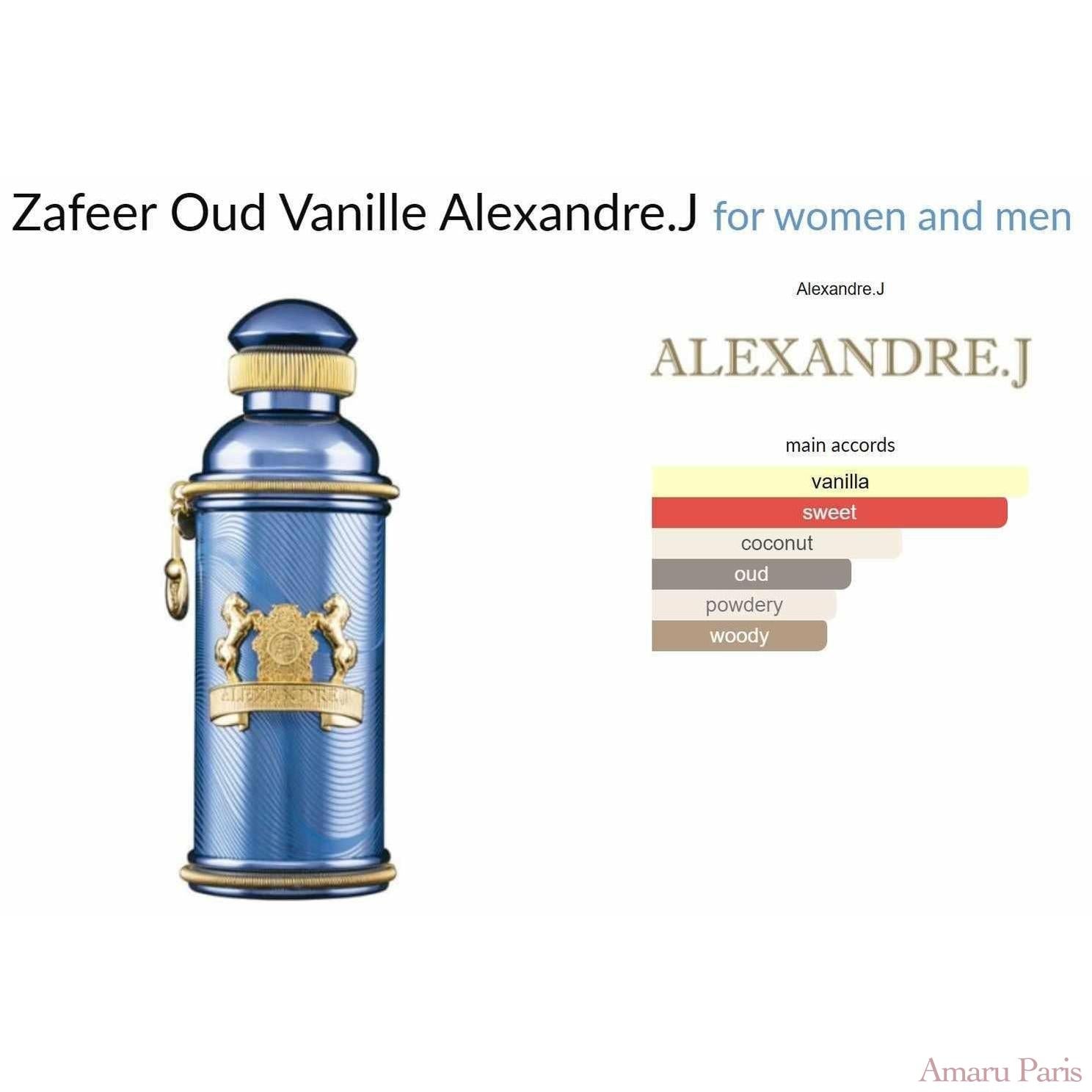 Zafeer Oud Vanille von Alexandre.J ist ein orientalischer Vanilleduft für Frauen und Männer. Zafeer Oud Vanille wurde 2012 auf den Markt gebracht. Die Kopfnoten sind Kokosnuss, Toffee und Leder; Die Herznoten sind Tonkabohne, Ylang-Ylang, Weißholz und Gewürznelken; Basisnoten sind Vanille, Adlerholz (Oud) und Moschus.
