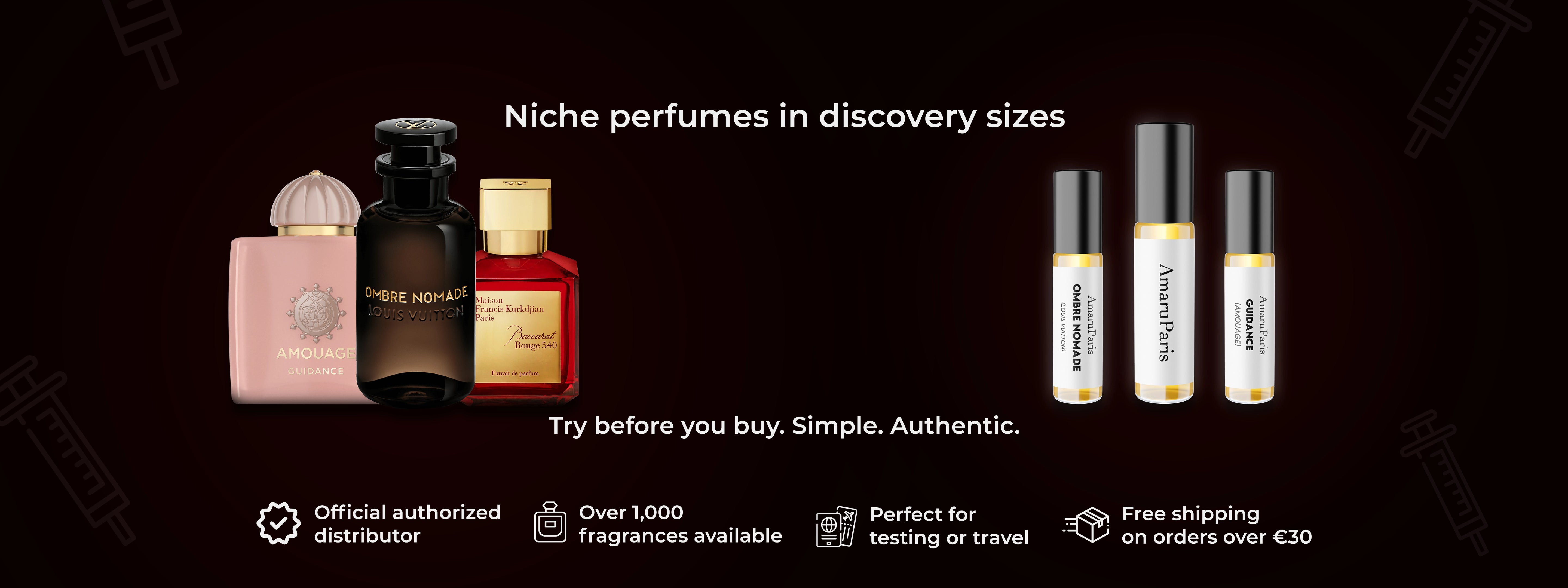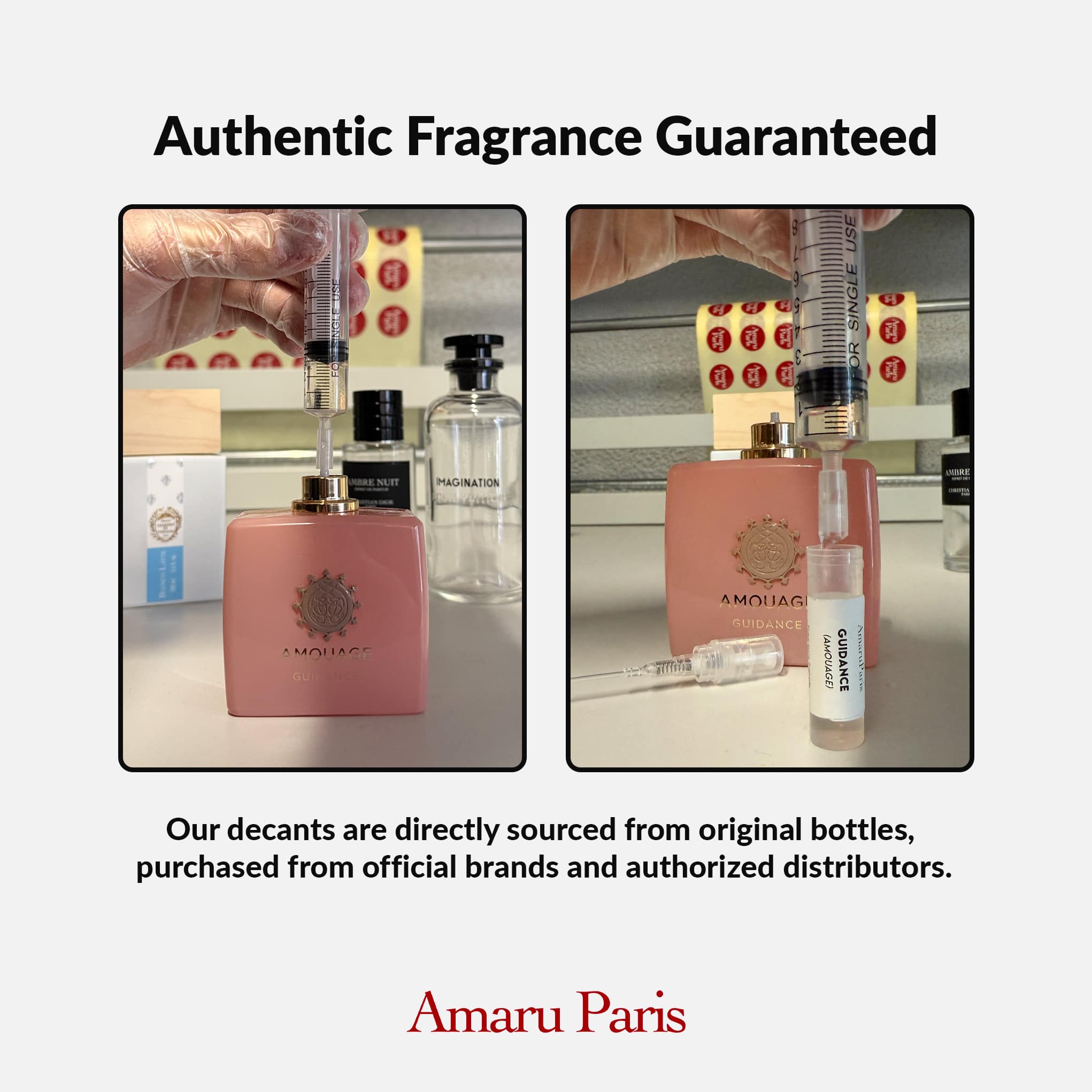 To ensure safety, our products are sampled from original perfumes using a sterile medical syringe and then transferred into a sample bottle with spray.