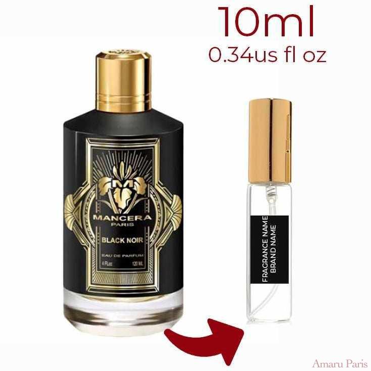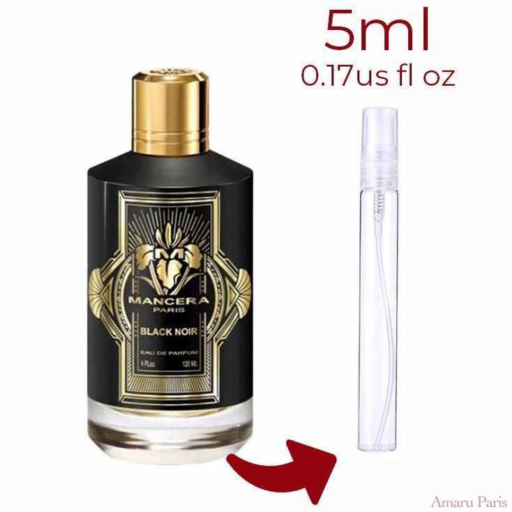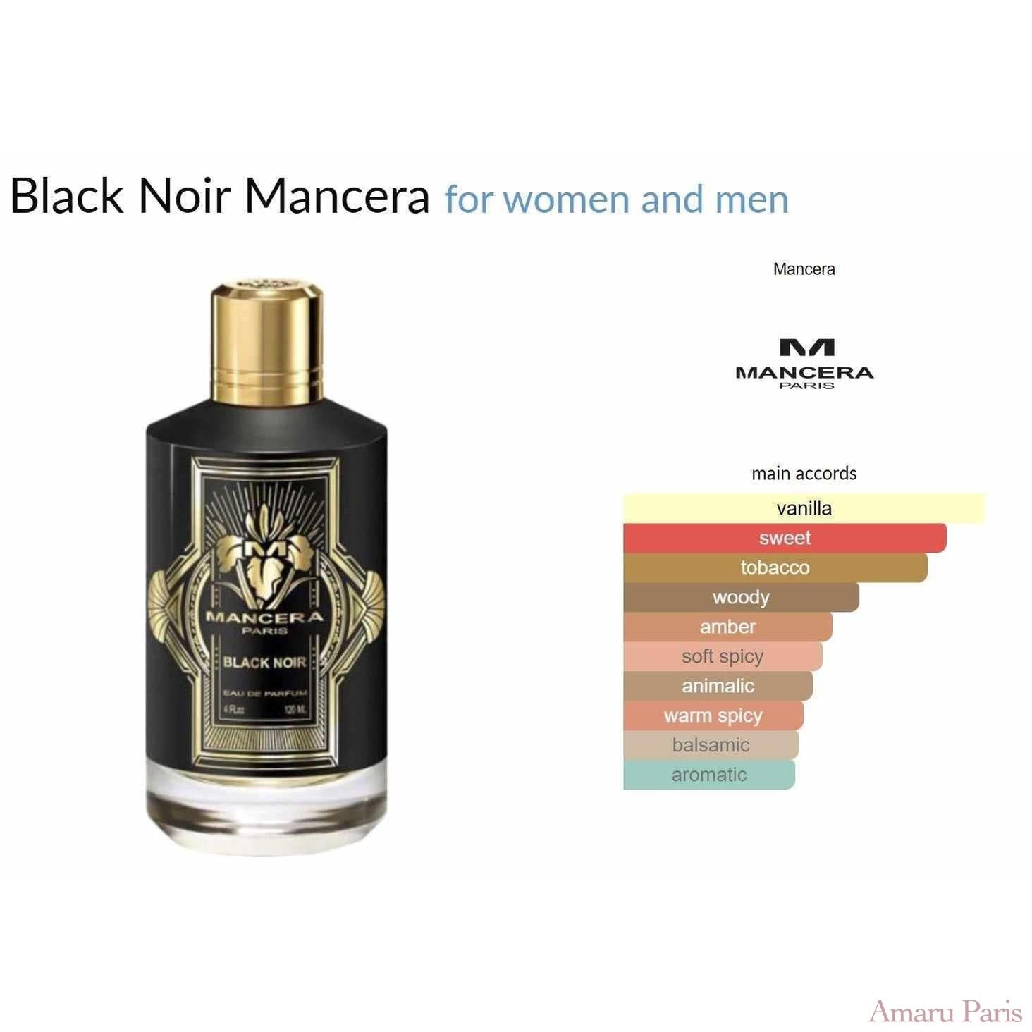 Black Noir de Mancera est un parfum pour homme et femme. Ce nouveau parfum a été lancé en 2023. Ses notes de tête sont le cuir noir et le poivre rose ; ses notes de cœur sont le tabac, l'oud du Cambodge, la fleur de tiaré et le patchouli ; ses notes de fond sont la vanille, la tonka, l'ambre gris et le vétiver de Haïti.
