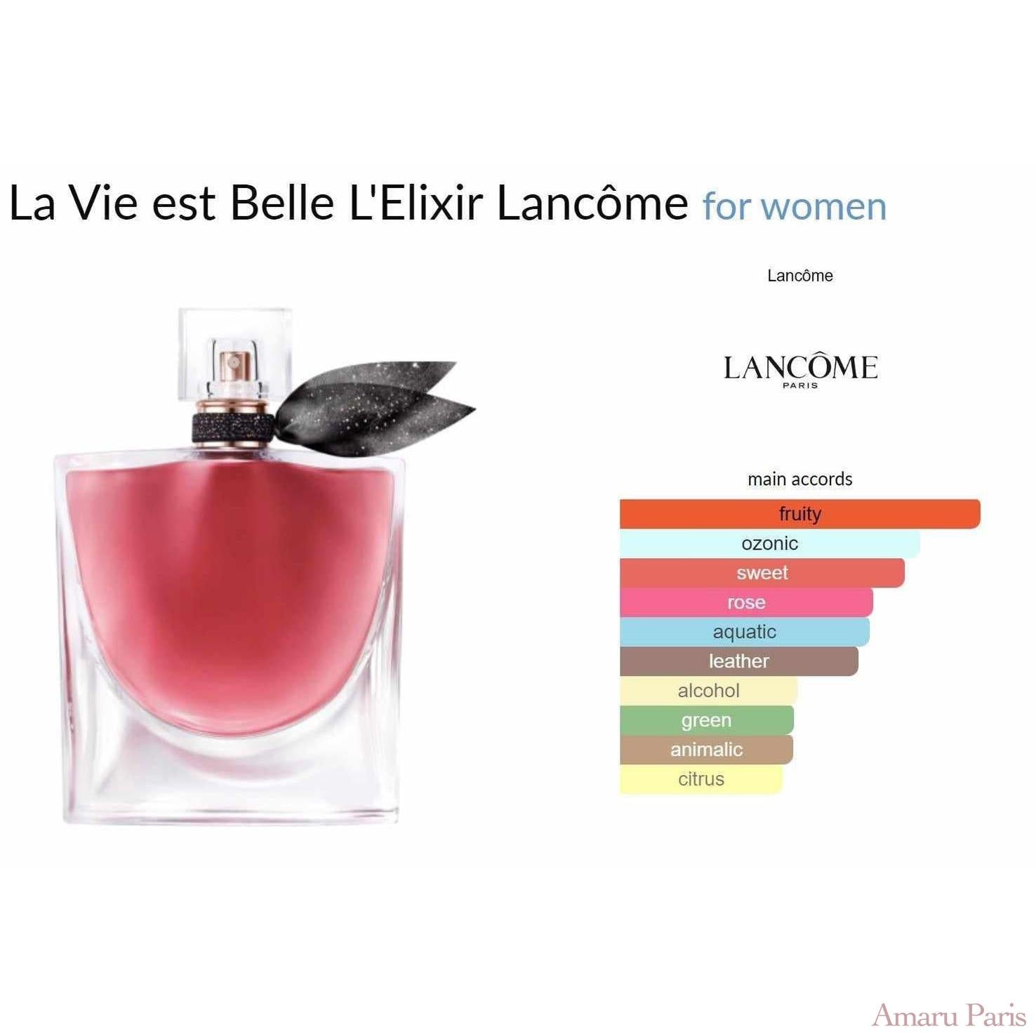 La Vie est Belle L'Élixir de Lancôme est un parfum floral fruité et gourmand pour femme. Il s'agit d'un nouveau parfum. La Vie est Belle L'Élixir a été lancé en 2024. La Vie est Belle L'Élixir a été créé par Antoine Maisondieu et Christophe Raynaud. Les notes de tête sont Framboise, Liqueur et Bergamote de Calabre ; les notes de cœur sont Feuille de violette et Rose ; les notes de fond sont Cuir, Beurre de cacao et Bois de cèdre.