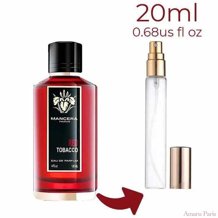 Red Tobacco de Mancera est un parfum boisé épicé pour femmes et hommes. Red Tobacco a été lancé en 2017. Les notes de tête sont la cannelle, le bois d'agar (oud), l'encens, le safran, la noix de muscade, la pomme verte et la poire blanche ; les notes de cœur sont le patchouli et le jasmin ; les notes de fond sont le tabac, la vanille de Madagascar, l'ambre, le bois de santal, le bois de gaïac, le musc blanc et le vétiver d'Haïti.