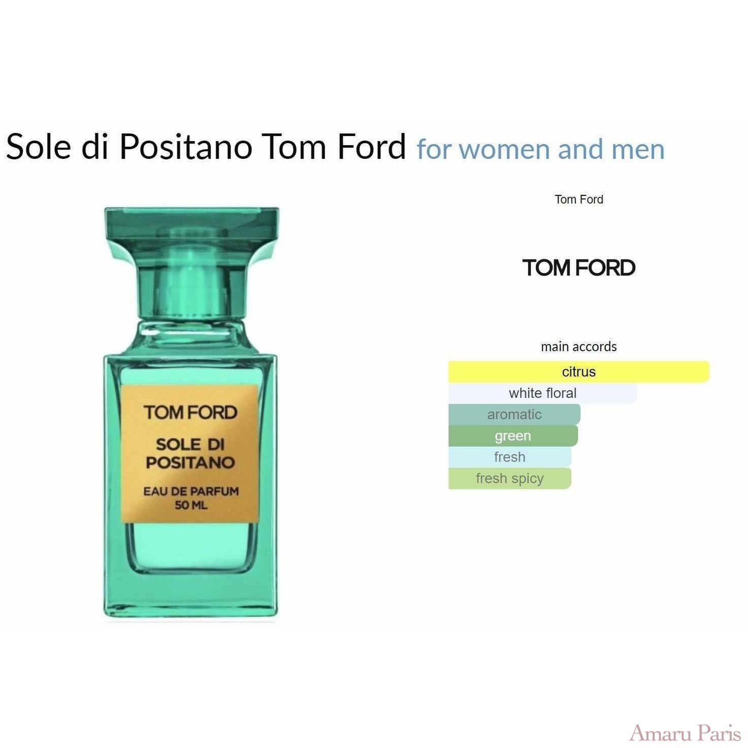 Sole di Positano de Tom Ford est un parfum hespéridé pour femme et homme. Sole di Positano a été lancé en 2017. Les notes de tête sont l'orange amère, la mandarine, la bergamote de Calabre, le citron et le petit-grain ; les notes de cœur sont le néroli, la fleur d'oranger, le jasmin, le shiso, l'ylang-ylang et le muguet ; la note de fond est la mousse.