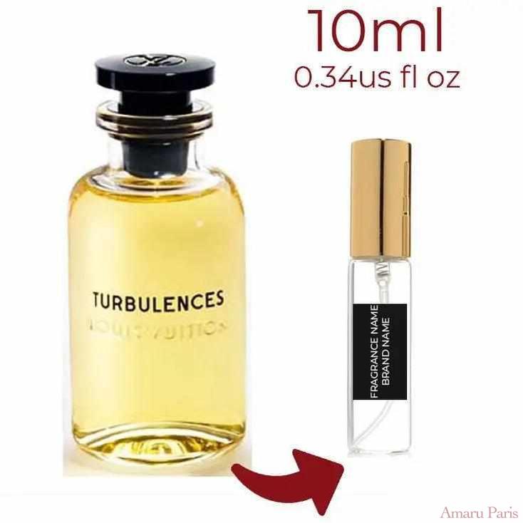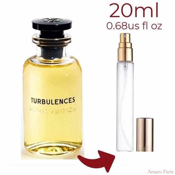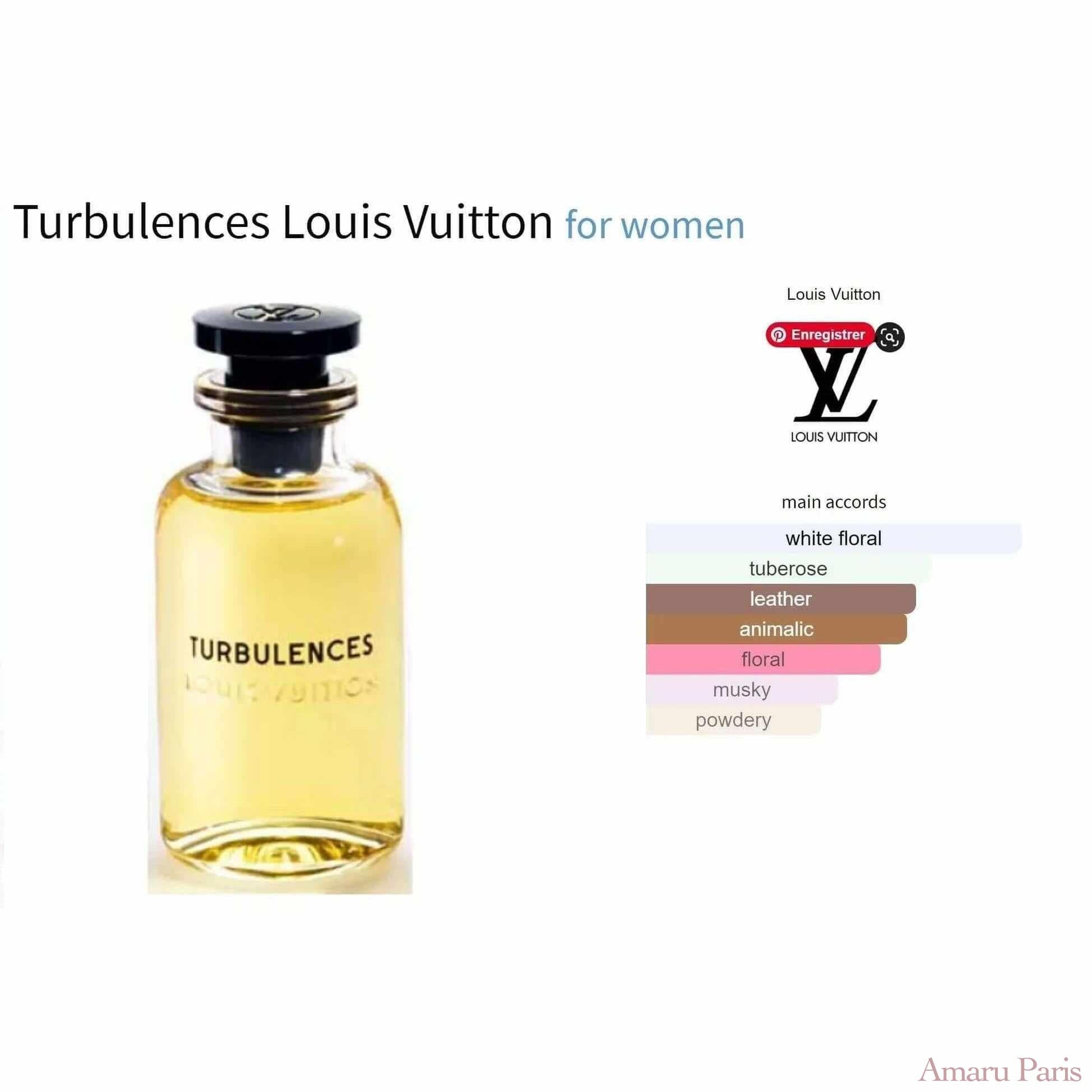 Turbulences de Louis Vuitton est un parfum floral ambré pour femme. Lancé en 2016, Turbulences est né du nez Jacques Cavallier. Sa note de tête est le jasmin ; ses notes de cœur sont la tubéreuse, le magnolia et la rose ; ses notes de fond sont le cuir, le musc et le bois de santal.