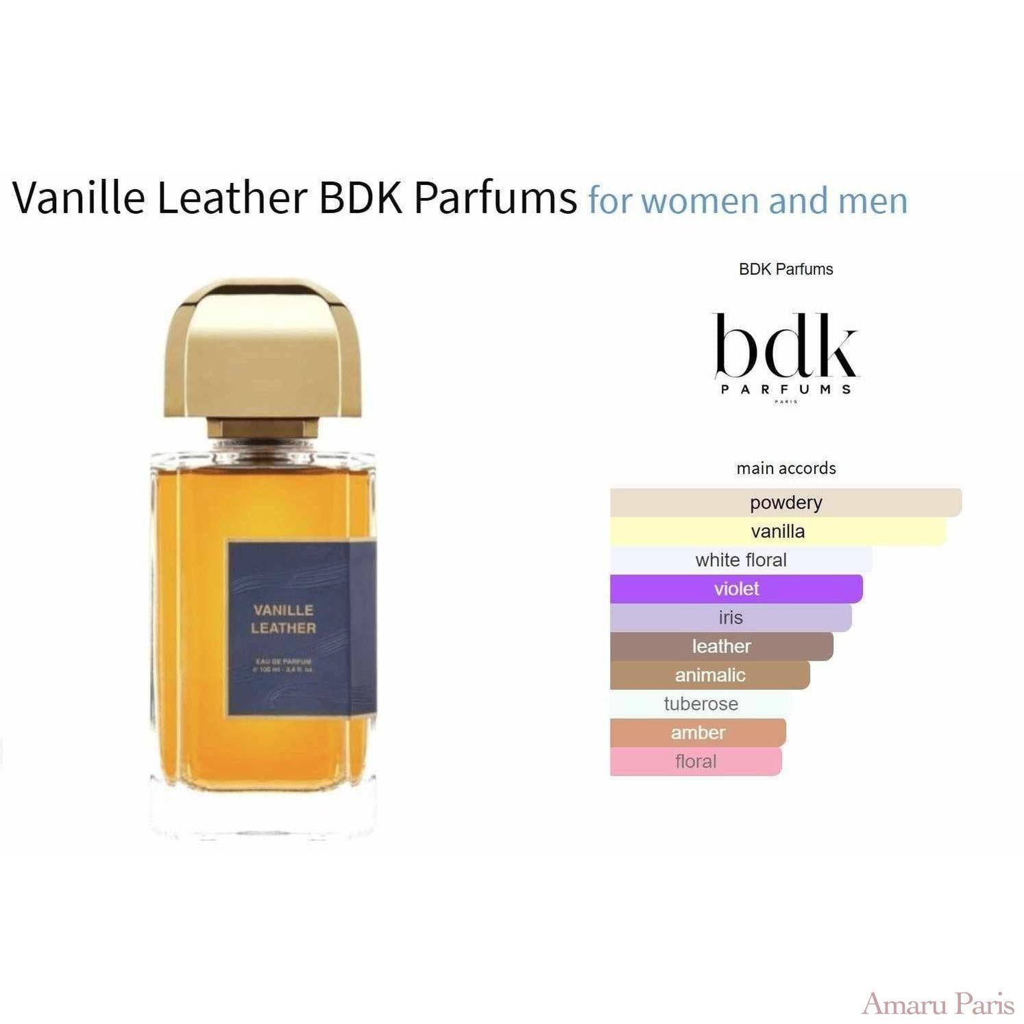 Vanille Leather de BDK Parfums est un parfum floral ambré pour femmes et hommes. Ce nouveau parfum a été lancé en 2023. Le nez derrière ce parfum est Dominique Ropion. Les notes de tête sont Violette et Poivre rose ; les notes de cœur sont Tubéreuse, Fleur d'oranger et Jasmin ; les notes de fond sont Vanille, Iris, Cuir, Benjoin, Chêne et Patchouli.