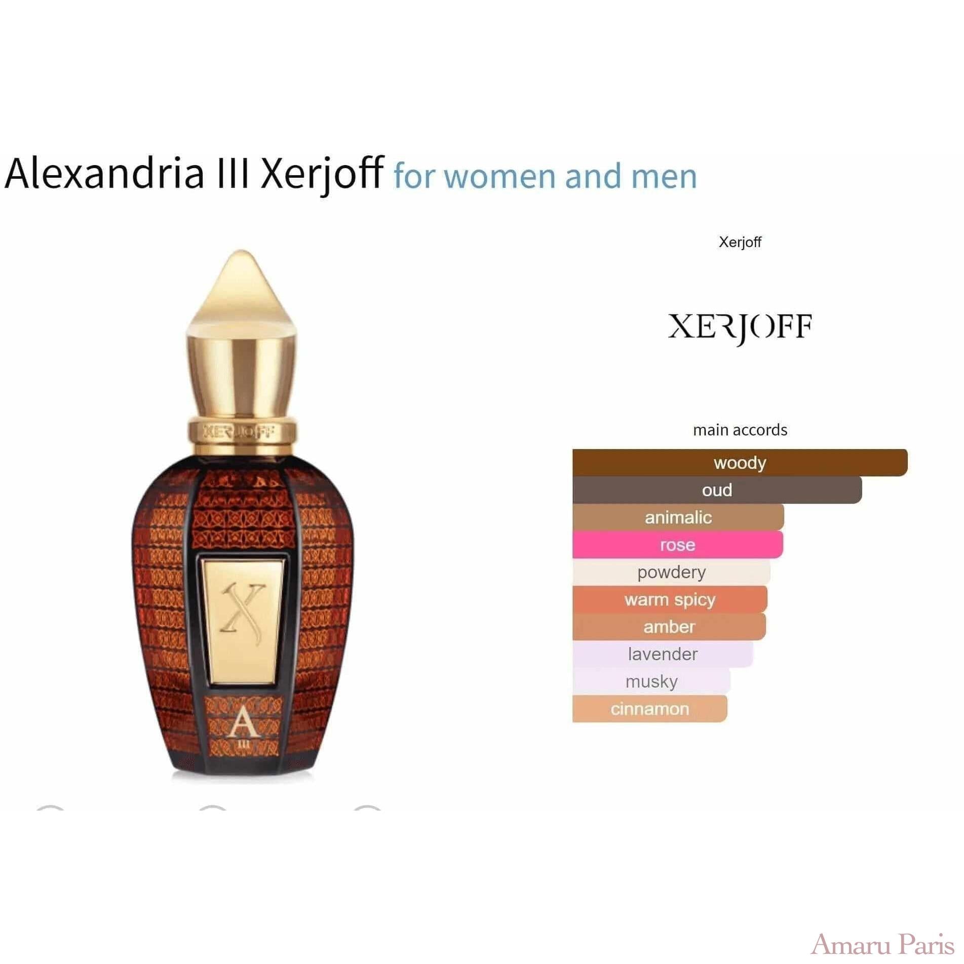 Alexandria III de Xerjoff est un parfum floral ambré pour femme et homme. Alexandria III a été lancé en 2019. Le nez derrière ce parfum est Chris Maurice. Les notes de tête sont le palissandre, la lavande et la cannelle ; les notes de cœur sont la rose de Bulgarie, le cèdre et le muguet ; les notes de fond sont l'oud du Laos, l'oud de Thaïlande, le bois de santal, le musc, l'ambre et la vanille.