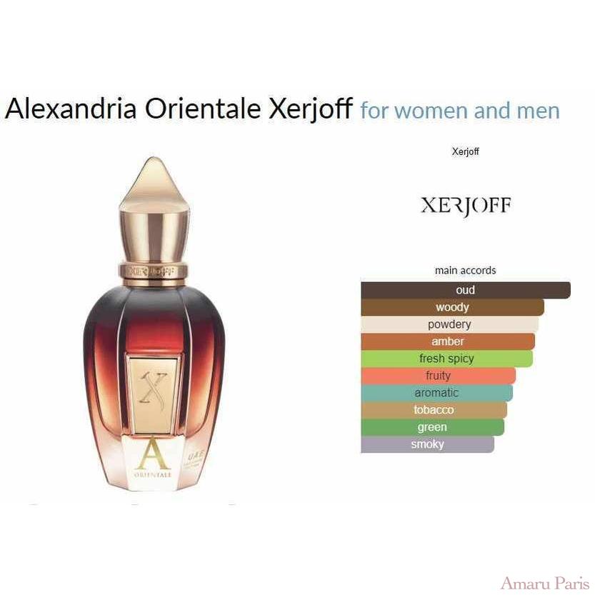 Alexandria Orientale de Xerjoff est un parfum oriental boisé pour femmes et hommes. Alexandria Orientale a été lancé en 2018. Le nez derrière ce parfum est Chris Maurice. Les notes de tête sont Pomme verte, Encens, Basilic et Cuir ; les notes de cœur sont Cèdre de Virginie, Rose bulgare, Coriandre et Racine d'iris d'Italie ; les notes de fond sont Bois d'agar (Oud), Feuille de tabac, Vanille de Madagascar, Musc, Bois de santal et Ambre.