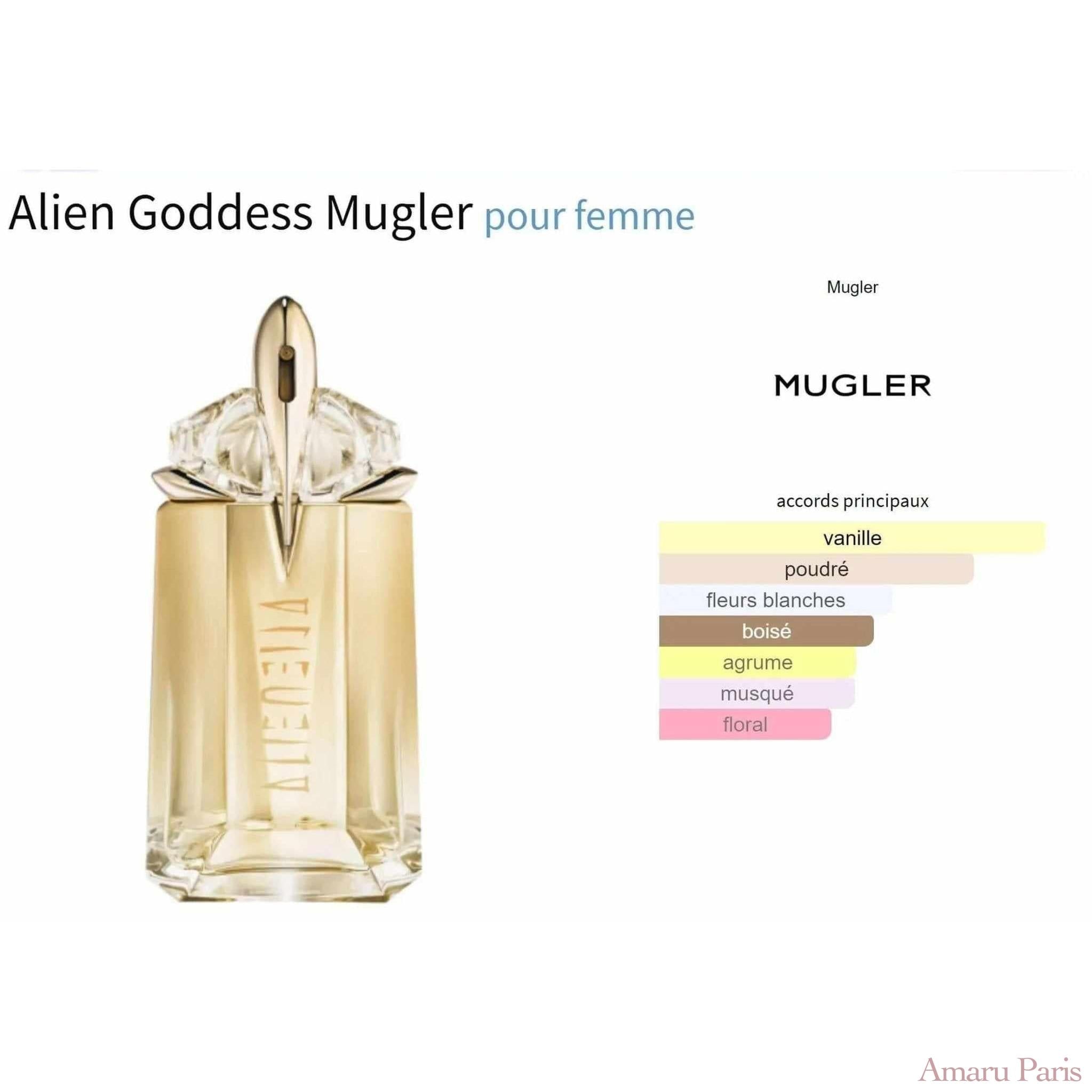 Alien Goddess de Mugler est un parfum floral ambré pour femme. Lancé en 2021, Alien Goddess a été créé par Nathalie Lorson et Marie Salamagne. Ses notes de tête sont l'eau de coco et la bergamote ; ses notes de cœur sont le jasmin et l'héliotrope ; ses notes de fond sont la vanille bourbon et le cachemire.