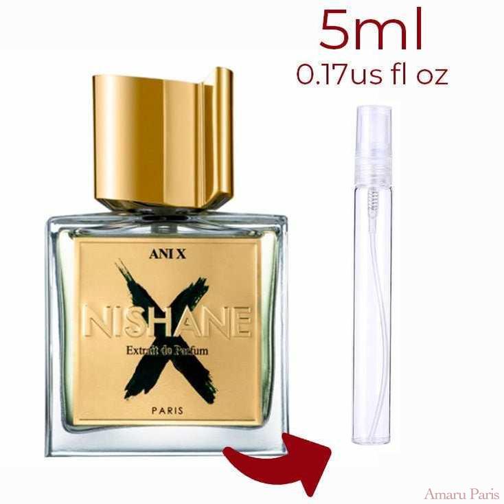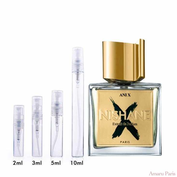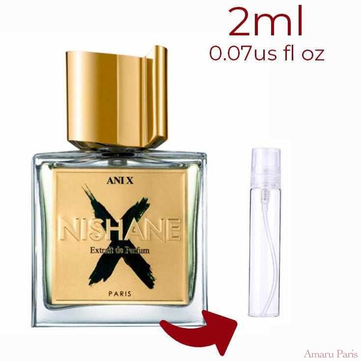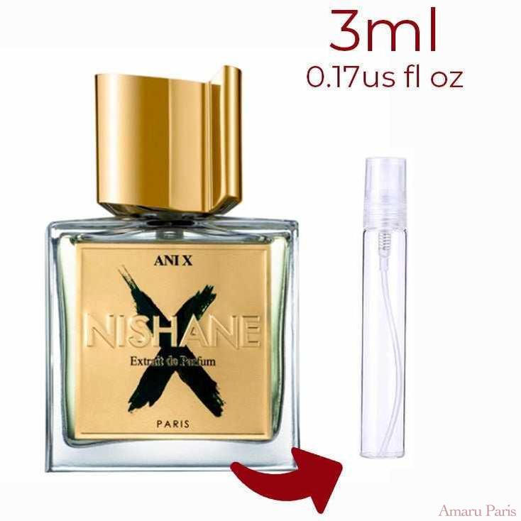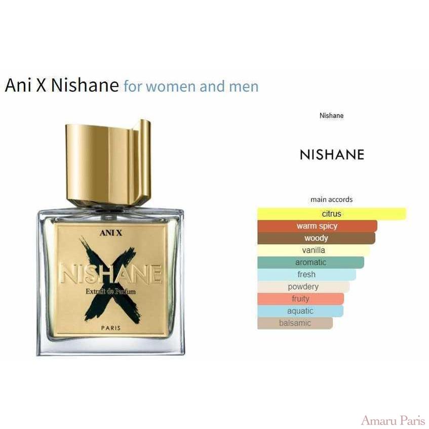 Ani X de Nishane est un parfum pour femmes et hommes. Ce nouveau parfum a été lancé en 2023. Le nez derrière ce parfum est Cécile Zarokian. Les notes de tête sont Citron, Bergamote, Melon, Gingembre, Cardamome, Notes Aquatiques et Poivre Rose ; les notes de cœur sont Pomme Verte, Patchouli, Cassis, Lavande, Sauge et Rose ; les notes de fond sont Vanille, Bois de Santal, Bois de Cachemire, Ambre Gris, Musc Blanc et Cèdre.