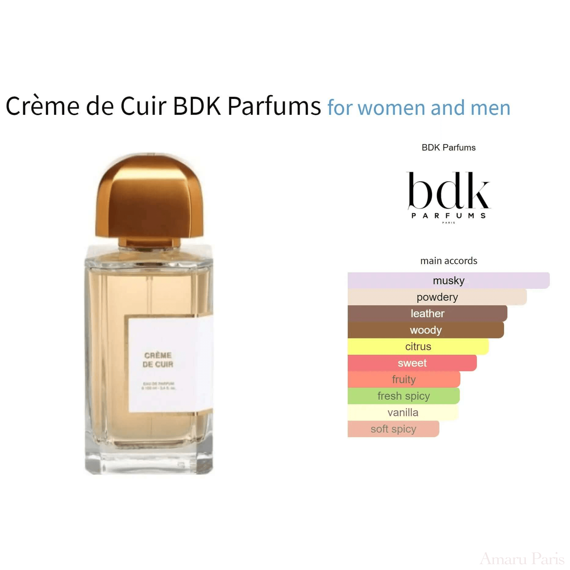 Crème de Cuir de BDK Parfums est un parfum cuir pour homme et femme. Lancé en 2018, il est signé Violaine Collas. Ses notes de tête sont Ananas, Pamplemousse, Bergamote et Mandarine ; ses notes de cœur sont Daim blanc, Poivre rose, Bois de santal et Poivre ; ses notes de fond sont Bois de cachemire, Vanille, Musc blanc, Musc gris et Bouleau.