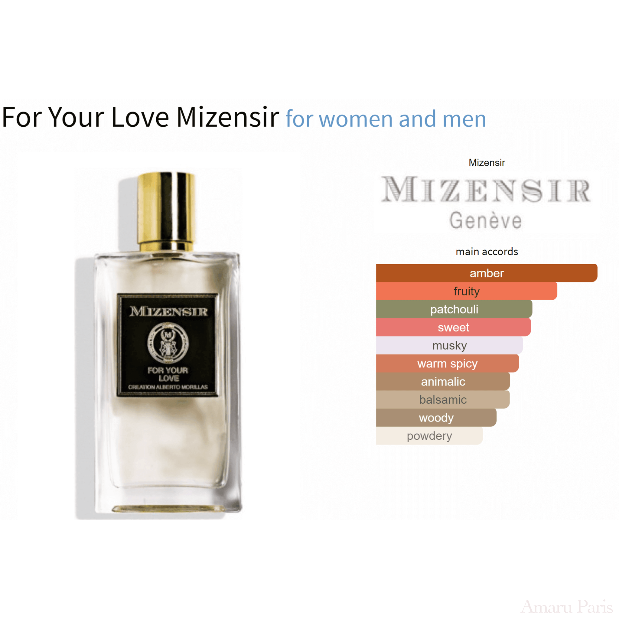 For Your Love de Mizensir est un parfum boisé pour femmes et hommes. For Your Love a été lancé en 2019. Le nez derrière ce parfum est Alberto Morillas. Les notes de tête sont Framboise et Musc ; la note de cœur est Ambre gris ; les notes de fond sont Patchouli et Benjoin.