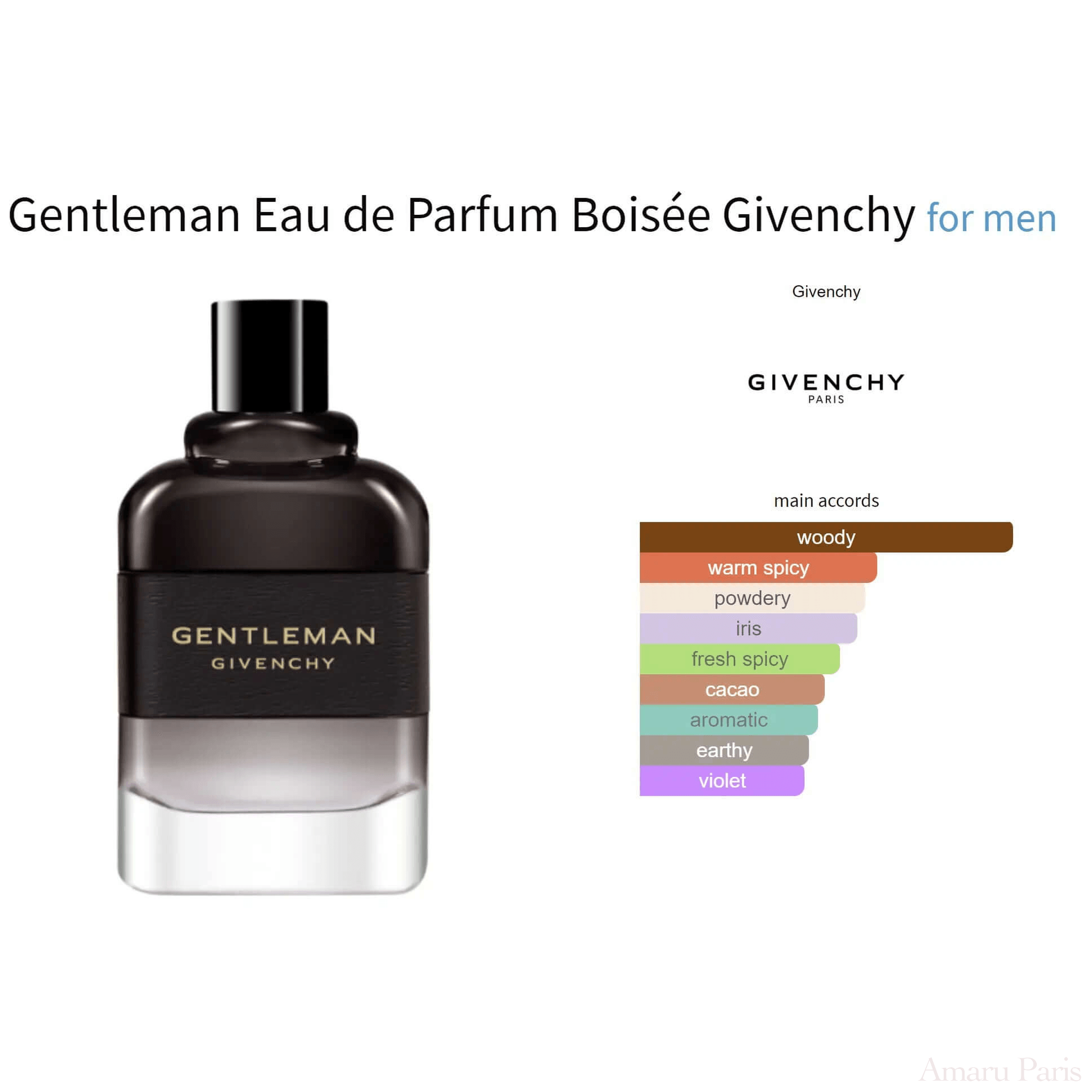 Gentleman Eau de Parfum Boisée de Givenchy est un parfum boisé et épicé pour homme. Gentleman Eau de Parfum Boisée a été lancé en 2020. Le nez derrière ce parfum est Olivier Cresp. Les notes de tête sont le poivre noir, le géranium et la coriandre ; les notes de cœur sont l'iris, la gousse de cacao et le cèdre ; les notes de fond sont les notes boisées, le bois de santal et le patchouli.