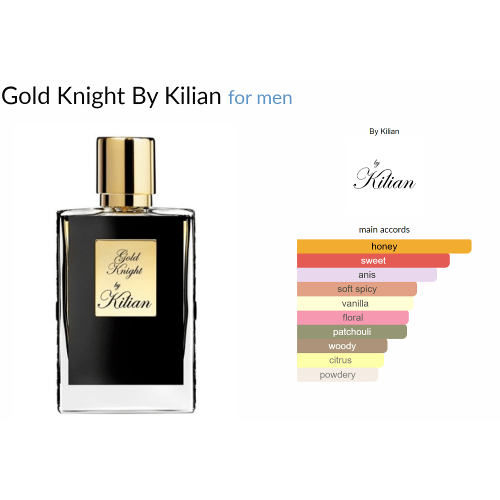 Gold Knight de Kilian est un parfum oriental boisé pour homme. Gold Knight a été lancé en 2017. Le nez derrière ce parfum est Pascal Gaurin. Les notes de tête sont l'anis et la bergamote ; les notes de cœur sont le miel et la vanille ; la note de fond est le patchouli.