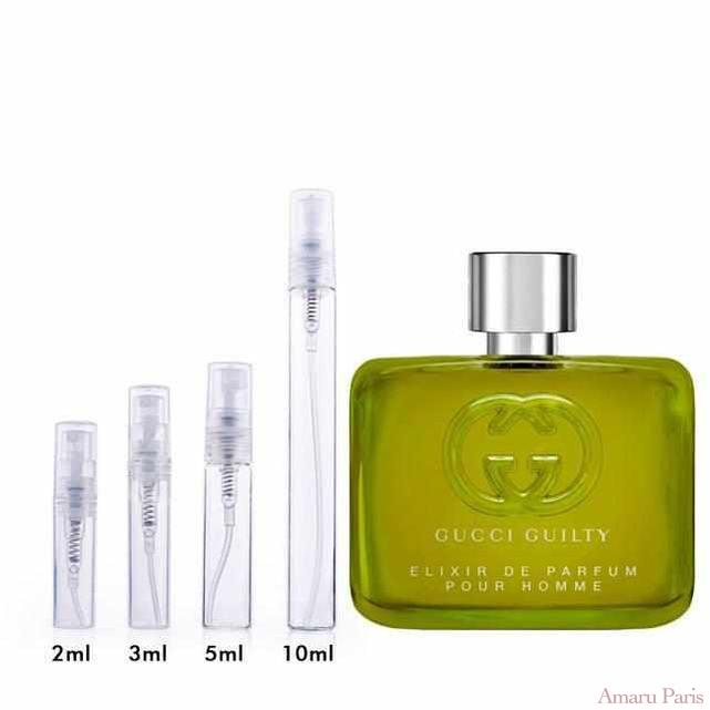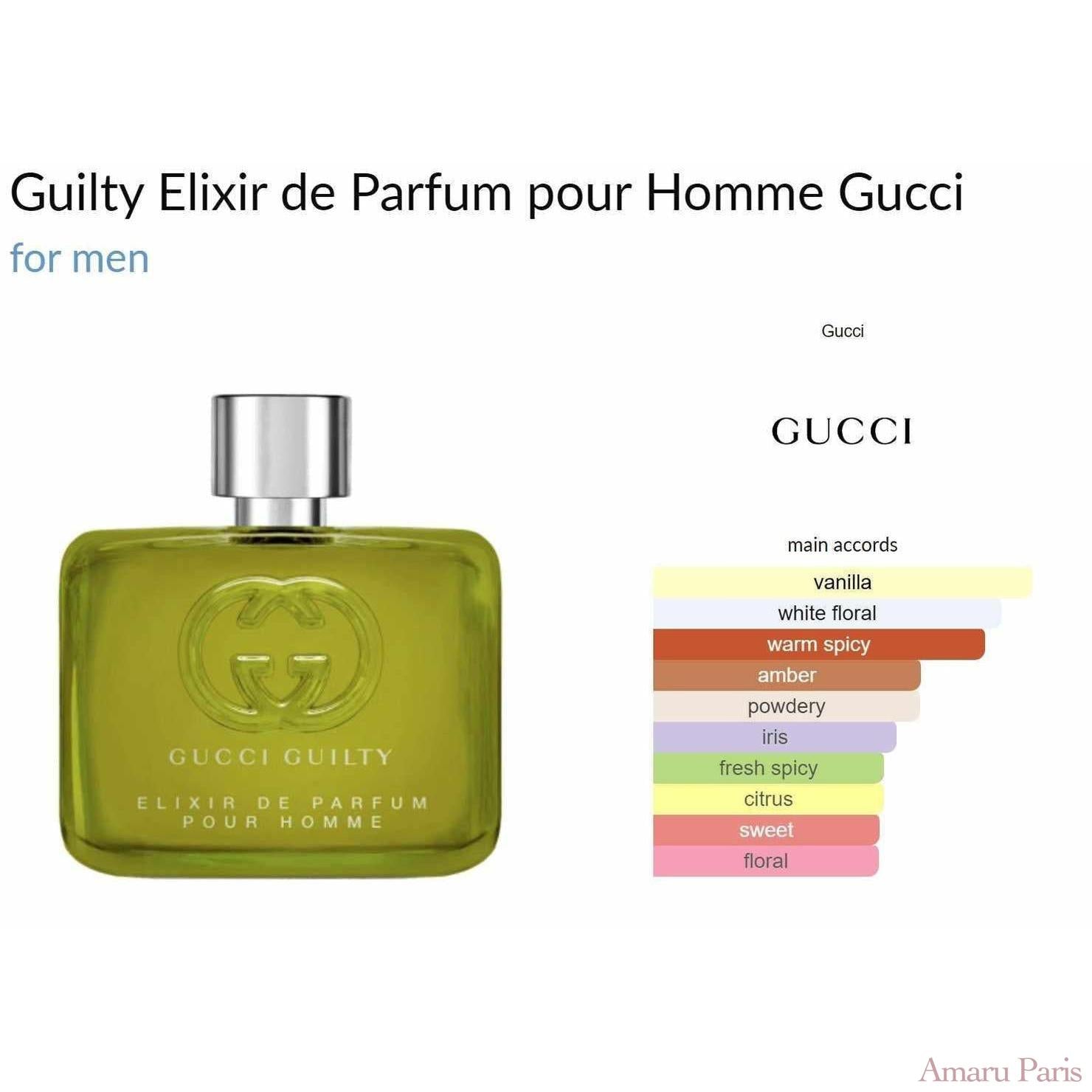 Guilty Elixir de Parfum pour Homme de Gucci est un parfum oriental boisé pour homme. Ce nouveau parfum a été lancé en 2023. Le nez derrière ce parfum est Quentin Bisch. Les notes de tête sont la fleur d'oranger, la noix de muscade et les graines de piment ; les notes de cœur sont la fleur d'oranger, l'iris et l'osmanthus ; les notes de fond sont la vanille, l'Ambrofix™, le benjoin et le patchouli.