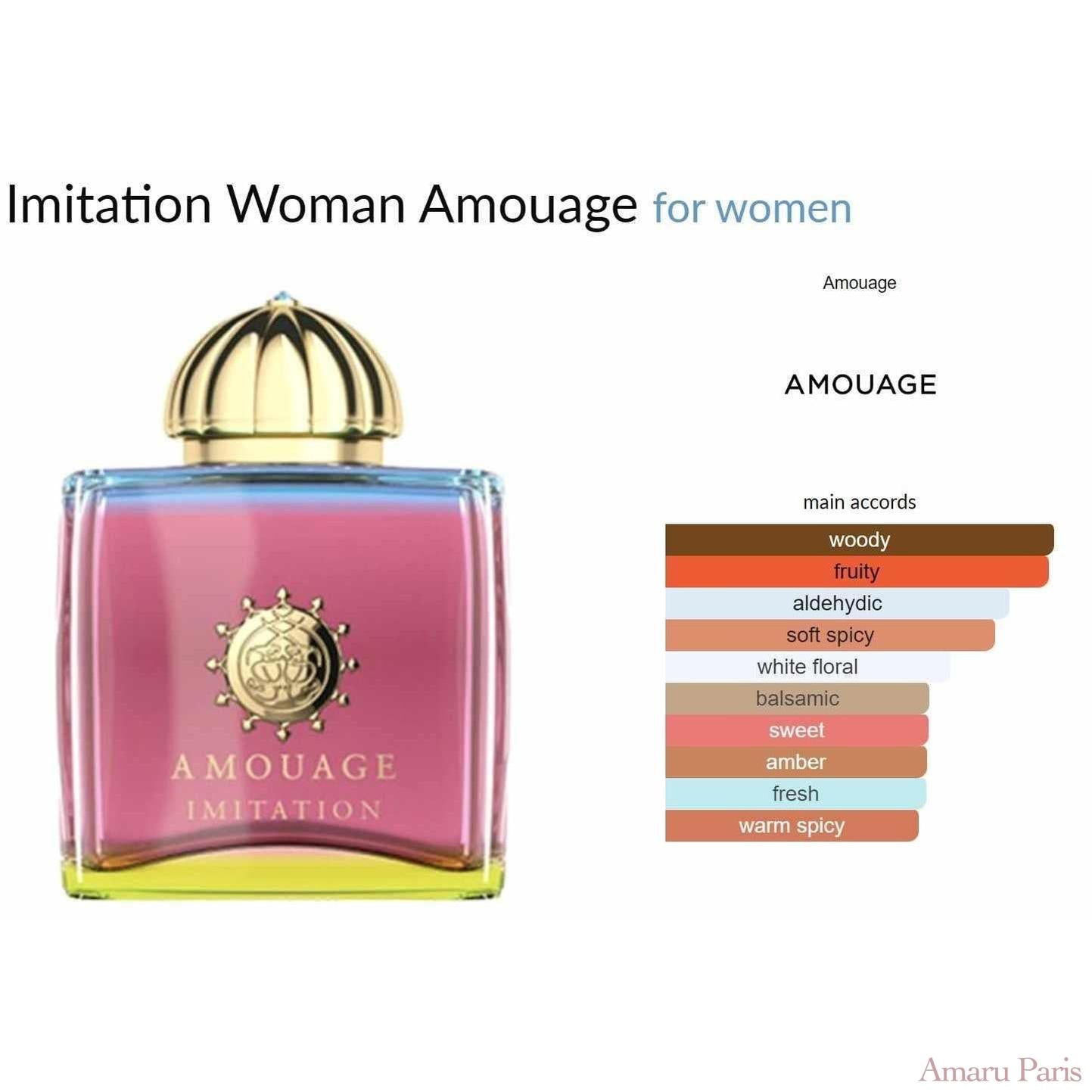 Imitation Woman d' Amouage est un parfum floral chypré pour femme. Imitation Woman a été lancé en 2018. Le nez derrière ce parfum est Pierre Negrin. Les notes de tête sont l'ylang-ylang, la fleur d'oranger, le jasmin et la rose ; les notes de cœur sont le cassis, les aldéhydes et la réglisse ; les notes de fond sont l'encens, le patchouli et le bois de santal.