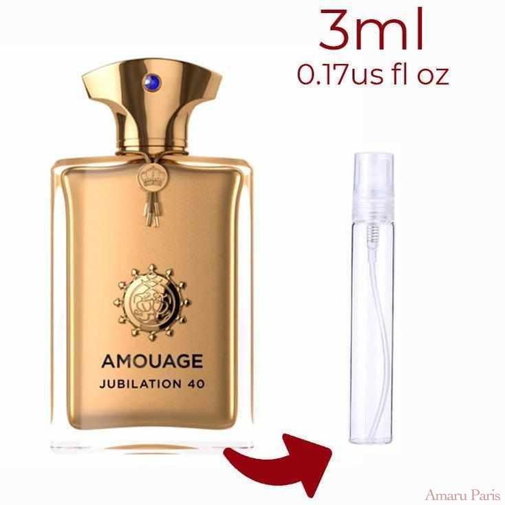 Jubilation 40 Man d'Amouage est un parfum boisé chypré pour homme. Il s'agit d'une nouvelle fragrance. Jubilation 40 Man a été lancé en 2023. Le nez derrière ce parfum est Bertrand Duchaufour. Les notes de tête sont la mûre, le labdanum, le cassis, l'orange, le davana et le romarin ; les notes de cœur sont l'encens, le genêt, le laurier, la cannelle, le clou de girofle, les graines de céleri et la rose ; les notes de fond sont l'opoponax, le patchouli, la myrrhe, la mousse, le bois d'agar (oud), le bois de gaïac, le cèdre, le musc, l'ambre gris et le ciste incanus.