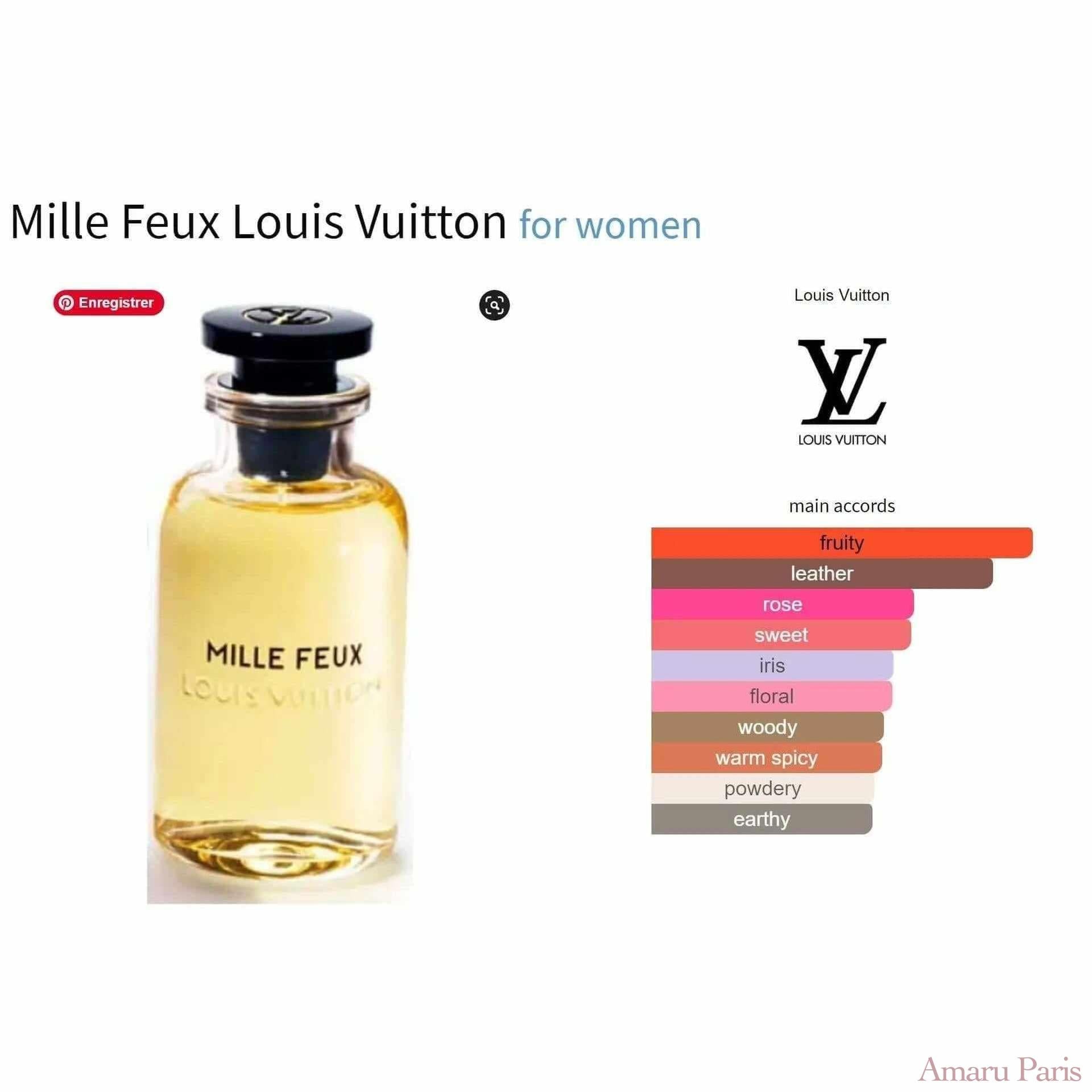 Mille Feux de Louis Vuitton est un parfum cuiré pour femme. Mille Feux a été lancé en 2016. Le nez derrière ce parfum est Jacques Cavallier. Les notes de tête sont Framboise et Bergamote ; les notes de cœur sont Rose, Safran, Osmanthus, Iris et Jasmin ; les notes de fond sont Cuir, Racine d'iris, Bois de santal, Mousse et Patchouli.