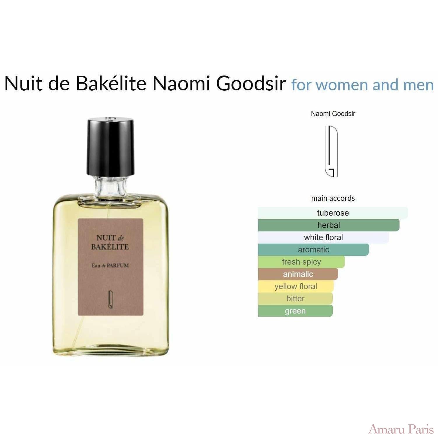 Nuit de Bakélite de Naomi Goodsir est un parfum floral vert pour femmes et hommes. Nuit de Bakélite a été lancé en 2017. Le nez derrière ce parfum est Isabelle Doyen. Les notes de tête sont le galbanum, la feuille de tomate, l'angélique et la feuille de violette ; les notes de cœur sont la tubéreuse, l'ylang-ylang, l'iris, les graines de carotte, le karo karounde et la cardamome ; les notes de fond sont l'armoise, le cuir, le styrax, le tabac, le labdanum et le bois de gaïac.