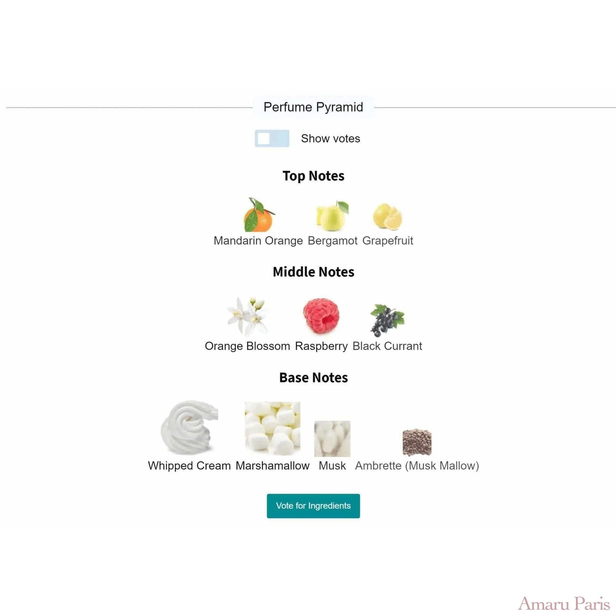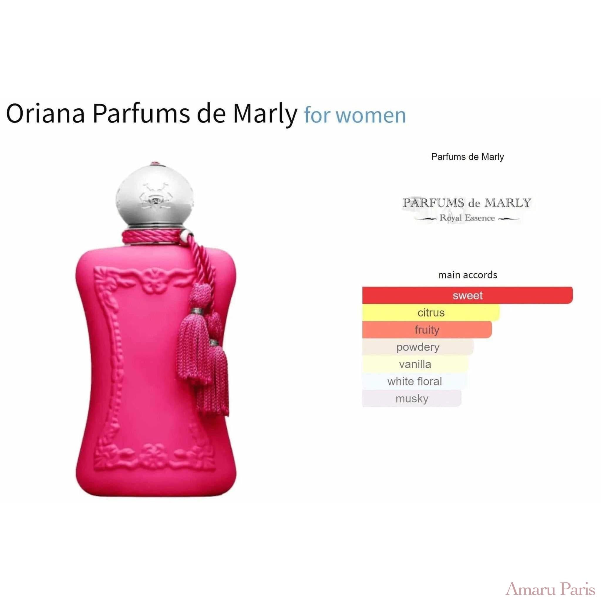 Oriana de Parfums de Marly est un parfum floral fruité et gourmand pour femme. Oriana a été lancé en 2021. Créé par Nathalie Lorson et Hamid Merati-Kashani, il se compose de mandarine, de bergamote et de pamplemousse ; de fleur d'oranger, de framboise et de cassis ; et de crème fouettée, de guimauve, de musc et d'ambrette.
