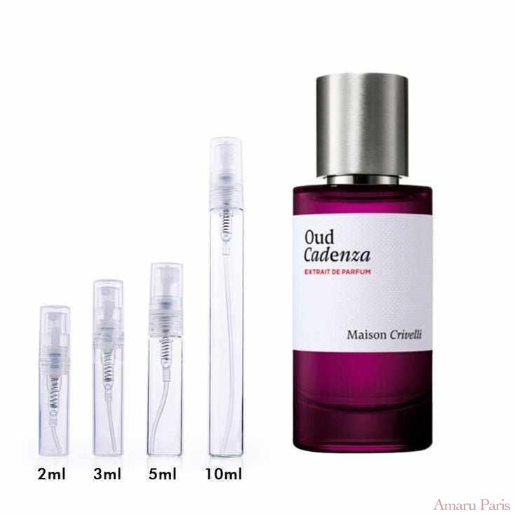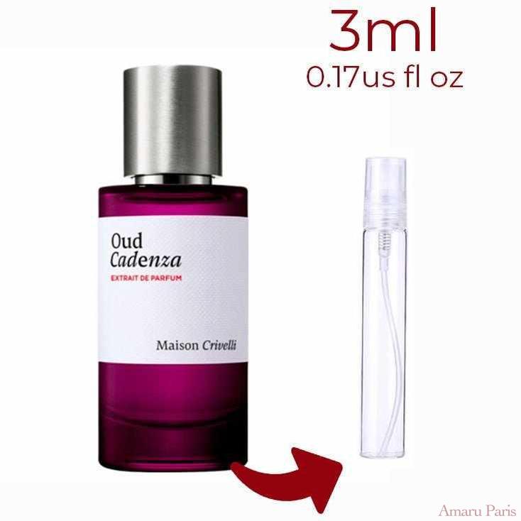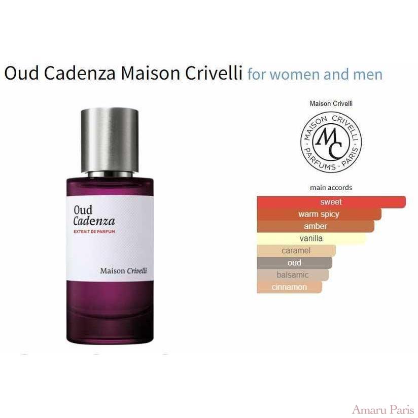 Oud Cadenza de Maison Crivelli est un parfum oriental boisé pour femmes et hommes. Il s'agit d'une nouvelle fragrance. Oud Cadenza a été lancé en 2024. Le nez derrière ce parfum est Jordi Fernandez. Les notes de tête sont Cannelle, Safran, Cardamome, Gingembre, Noix de muscade et Poivre rose ; les notes de cœur sont Dattes, Caramel, Bois d'Agar (Oud), Canne à Sucre, Encens, Bois d'Ambre, Myrrhe et Davana ; les notes de fond sont Vanille de Madagascar, Tonka, Beurre de cacao, Cuir, Musc, Benjoin, Ciste, Patchouli et Maté.