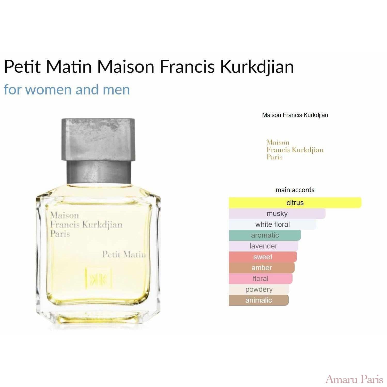Petit Matin de Maison Francis Kurkdjian est un parfum aromatique vert pour femmes et hommes. Petit Matin a été lancé en 2016. Le nez derrière ce parfum est Francis Kurkdjian.