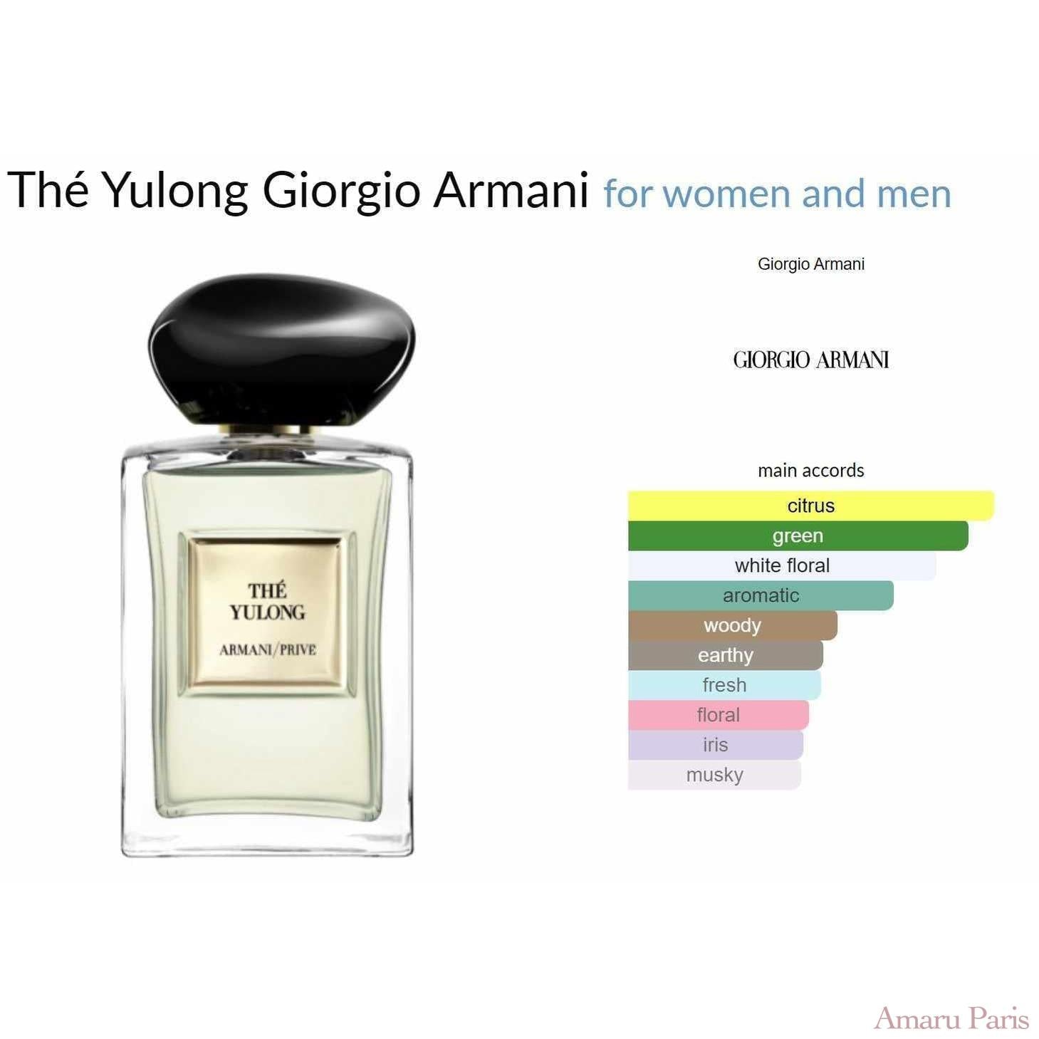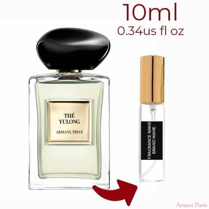 Thé Yulong de Giorgio Armani est un parfum aromatique vert pour femme et homme. Thé Yulong a été lancé en 2020. Le nez derrière ce parfum est Julie Massé. Les notes de tête sont Mandarine, Petit-grain et Cardamome ; les notes de cœur sont Thé vert, Thé noir, Fleur d'oranger et Jasmin ; les notes de fond sont Vétiver, Ambrette (Mauve musquée) et Iris.