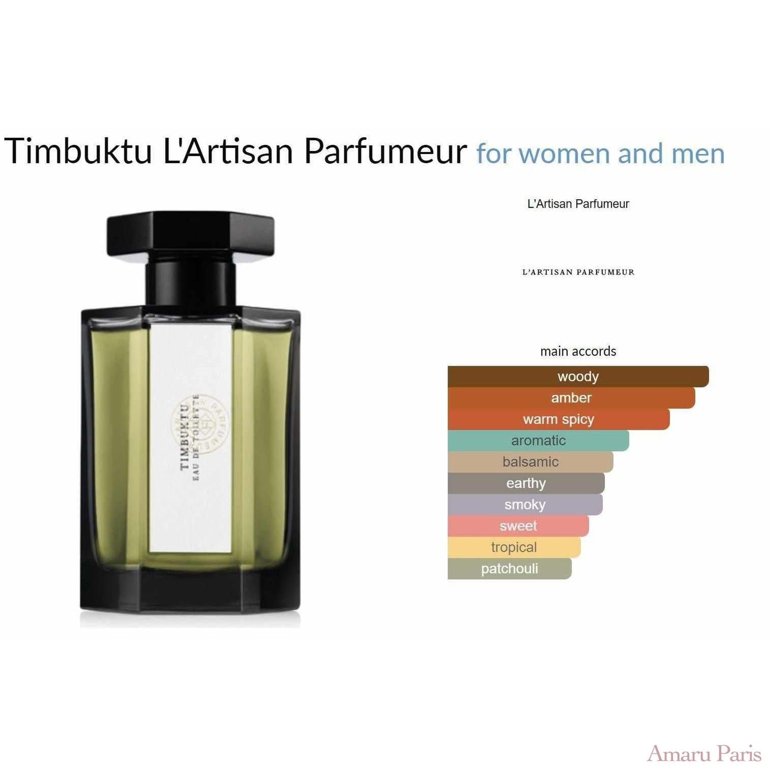 Timbuktu de L'Artisan Parfumeur est un parfum boisé chypré pour femmes et hommes. Timbuktu a été lancé en 2004. Le nez derrière ce parfum est Bertrand Duchaufour. Les notes de tête sont Mangue, Poivre rose et Cardamome ; les notes de cœur sont Encens, Papyrus et Karo Karounde ; les notes de fond sont Vétiver, Myrrhe, Patchouli et Benjoin.