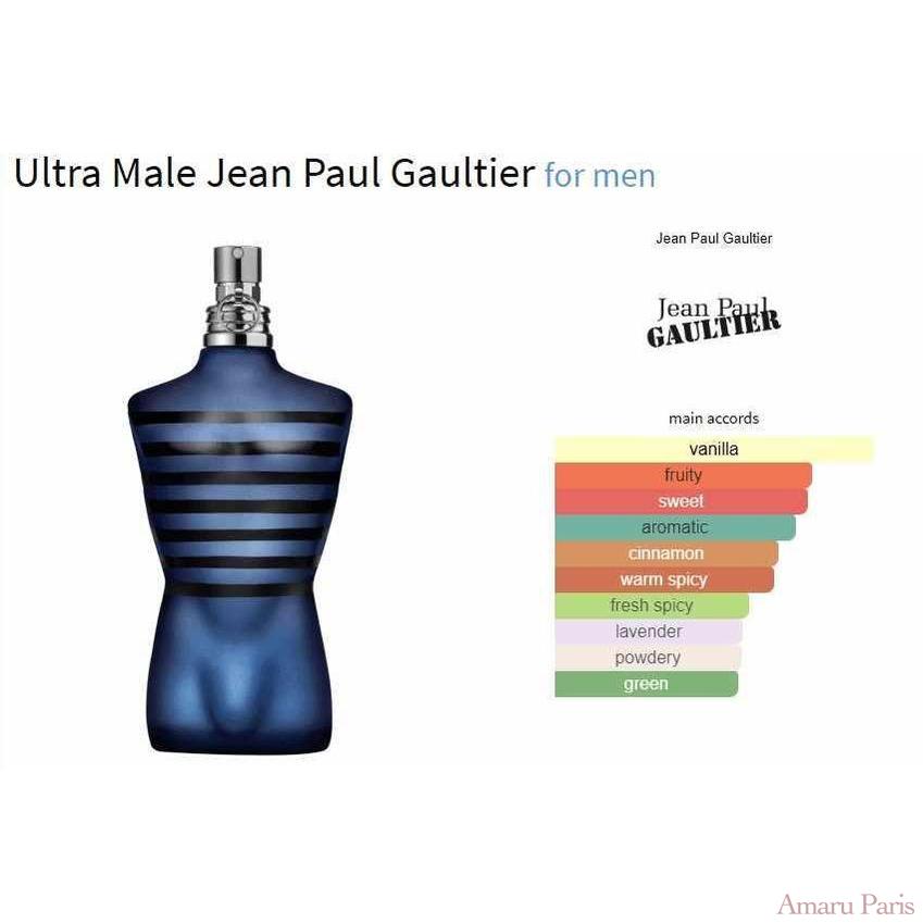 Ultra Male de Jean Paul Gaultier est un parfum masculin à la fougère ambrée. Ultra Male a été lancé en 2015. Le nez derrière ce parfum est Francis Kurkdjian. Les notes de tête sont Poire, Lavande, Menthe, Bergamote et Citron ; les notes de cœur sont Cannelle, Sauge sclarée et Carvi ; les notes de fond sont Vanille noire, Ambre, Patchouli et Cèdre.