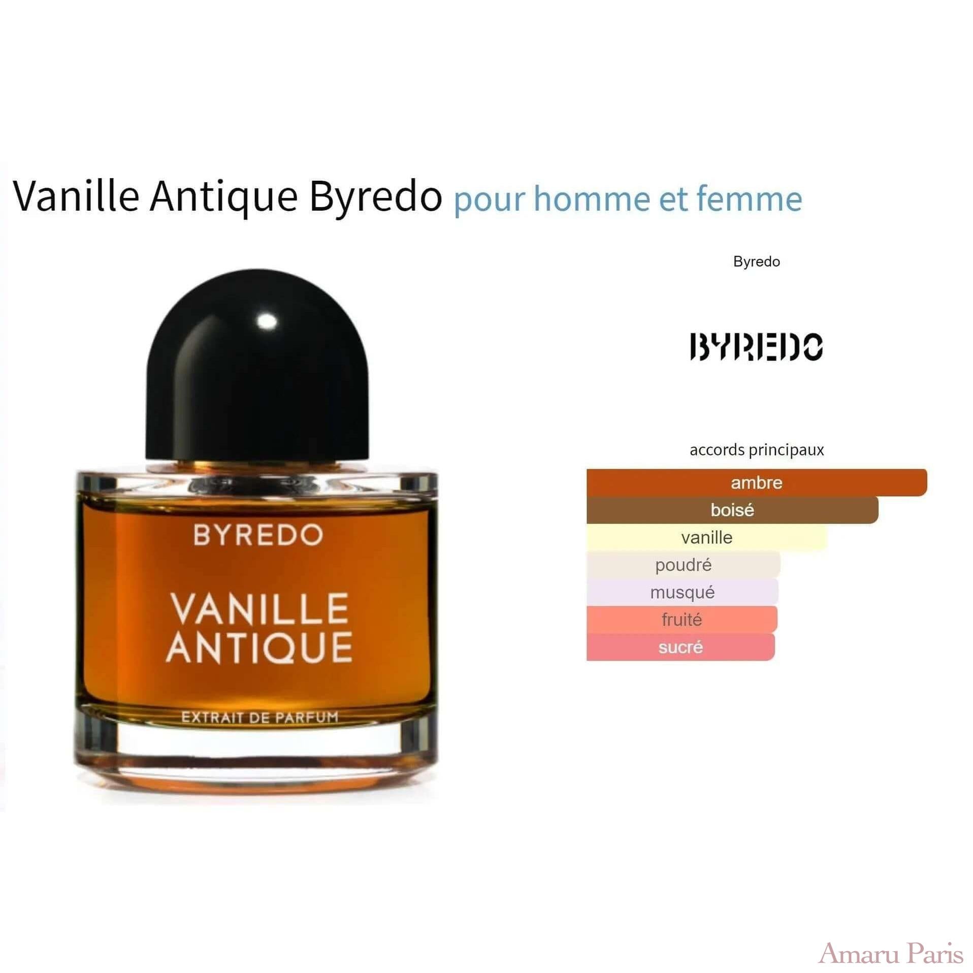 Vanille Antique de Byredo est un parfum ambré boisé pour femmes et hommes. Il s'agit d'un nouveau parfum. Vanille Antique a été lancé en 2022. Les notes de tête sont Musc et Prune ; les notes de cœur sont Bois blanc et Ciste ; les notes de fond sont Vanille et Ambre.