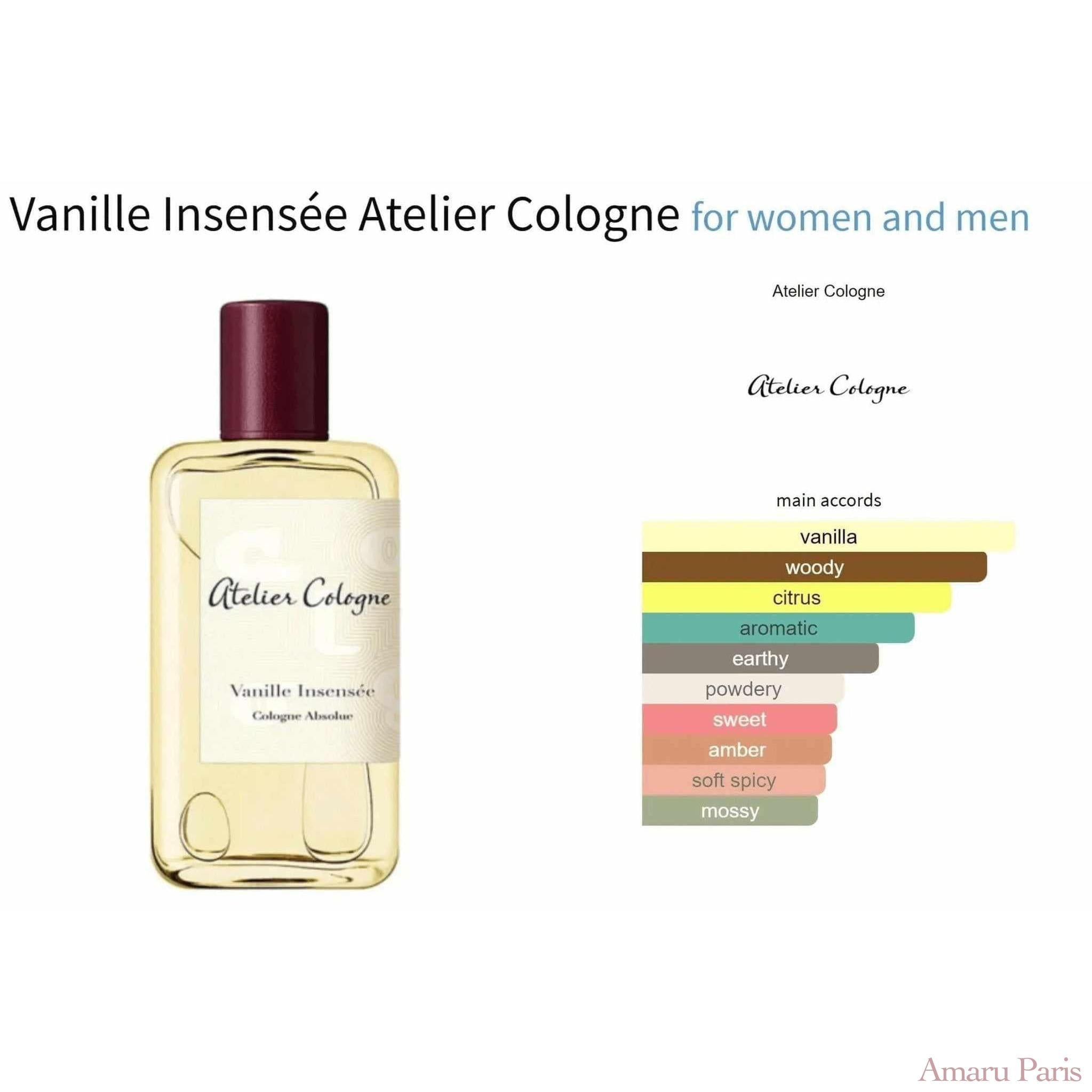 Vanille Insensée d'Atelier Cologne est un parfum boisé pour femme et homme. Vanille Insensée a été lancé en 2011. Le nez derrière ce parfum est Ralf Schwieger. Les notes de tête sont le citron vert, le cédrat et la coriandre ; les notes de cœur sont le vétiver, la mousse de chêne et le jasmin ; les notes de fond sont la vanille, le chêne et l'ambre.