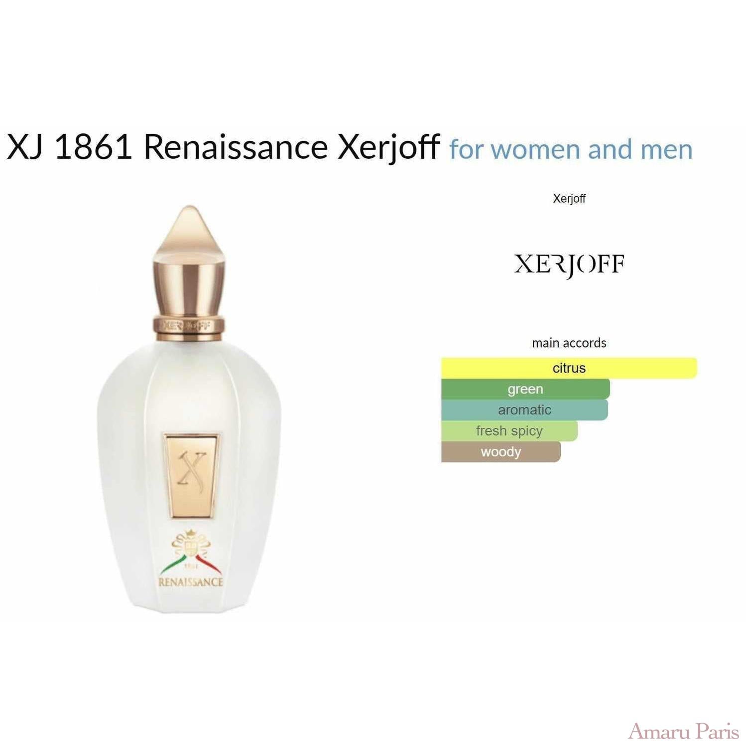 XJ 1861 Renaissance de Xerjoff est un parfum aromatique aux agrumes pour femmes et hommes. XJ 1861 Renaissance a été lancé en 2011. Les notes de tête sont le citron d'Amalfi, la mandarine, la bergamote et le petit-grain ; les notes de cœur sont la menthe, le muguet et la rose ; les notes de fond sont le musc, le cèdre de Virginie, le patchouli et l'ambre.