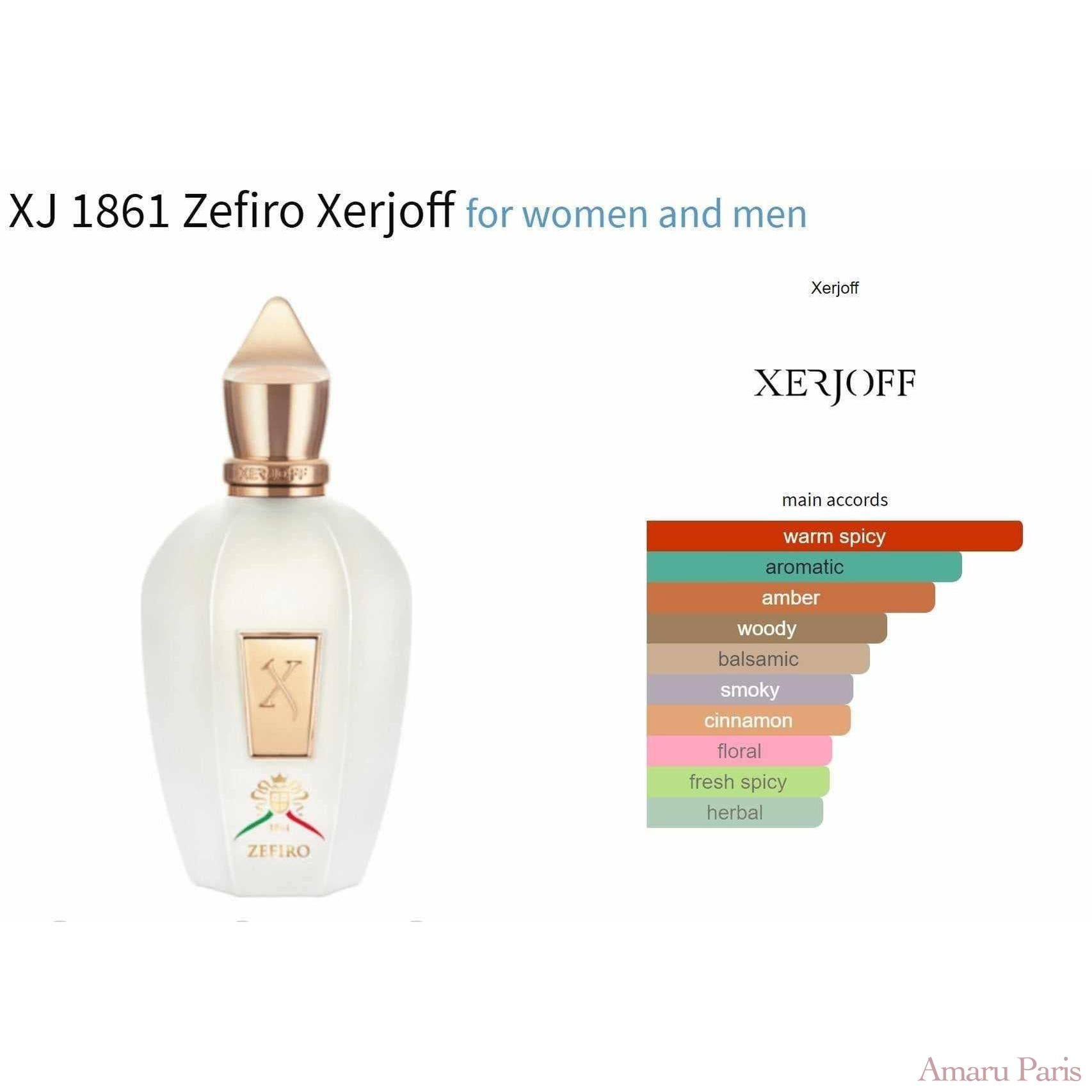 XJ 1861 Zefiro de Xerjoff est un parfum oriental épicé pour femme et homme. XJ 1861 Zefiro a été lancé en 2015. Le nez derrière ce parfum est Mathieu Nardin. Les notes de tête sont la résine d'élémi, le vin blanc, l'armoise et la bergamote ; les notes de cœur sont la cardamome, la cannelle, l'œillet et l'iris ; les notes de fond sont l'encens, les notes boisées, l'ambre et le miel.